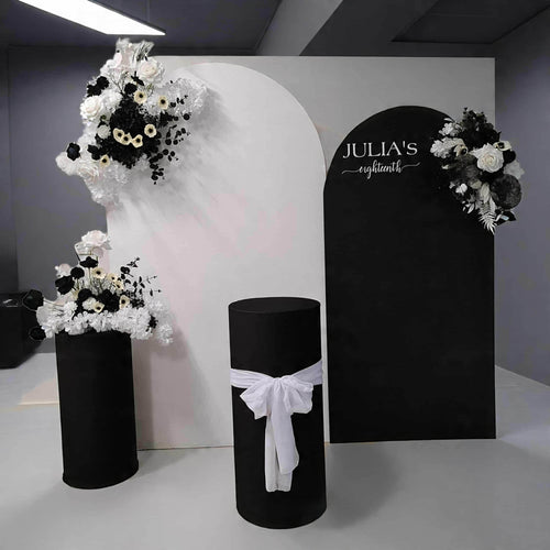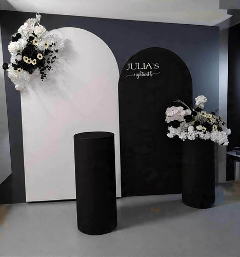 2 x arch backdrop (black & white), 2 x black & white flowers, 2 x cylinder plinths - HIRE ONLY