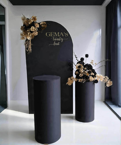Black arch backdrop, 2 x black & gold flowers & 2 x black plinths - HIRE ONLY
