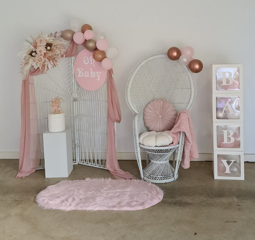 Baby Shower blush flowers, backdrop & peacock chair – Advanced Package - HIRE ONLY