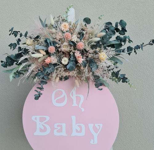 Baby shower green / pink flowers & easel - Oh Baby - Welcome sign - HIRE ONLY