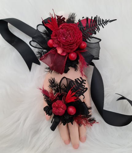 Red & black everlasting flowers corsage & buttonhole set - School formal, prom, graduation, wedding