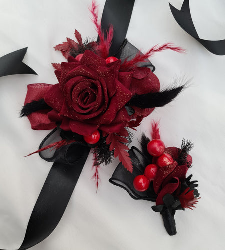 Black & burgundy corsage & buttonhole set - School formal, prom, graduation, wedding