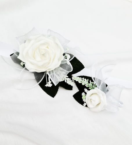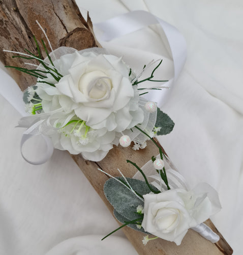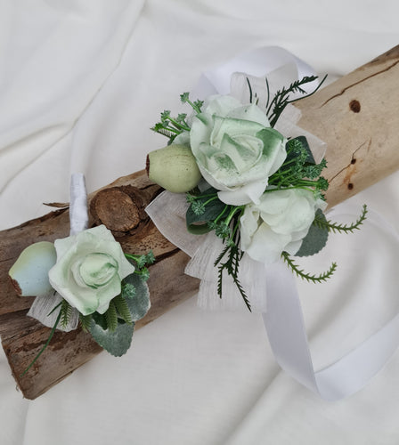 Green & white corsage & buttonhole set Style 2 - School formal, prom, graduation, wedding