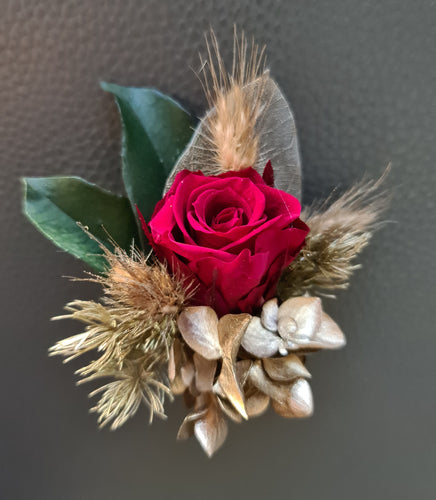 Everlasting flowers wedding buttonhole – red, green & gold