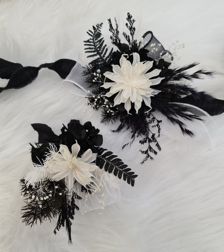 Unique black & white preserved flowers corsage & boutonniere set - School formal, prom, graduation, wedding