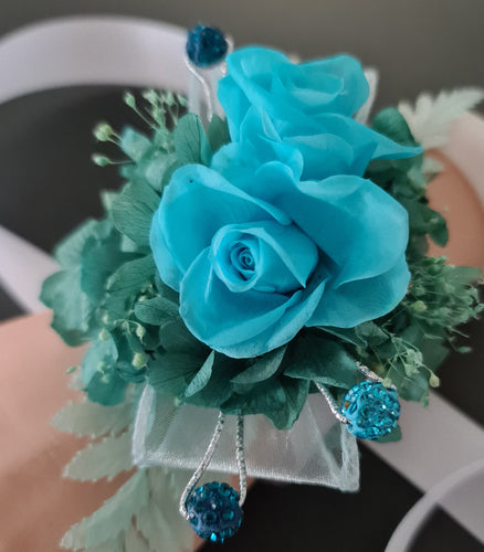 Turquoise & teal preserved flowers corsage w crystals - School formal, prom, graduation, wedding