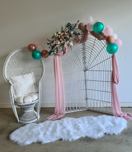 Pink/green package w white backdrop, flowers & peacock chair - HIRE ONLY