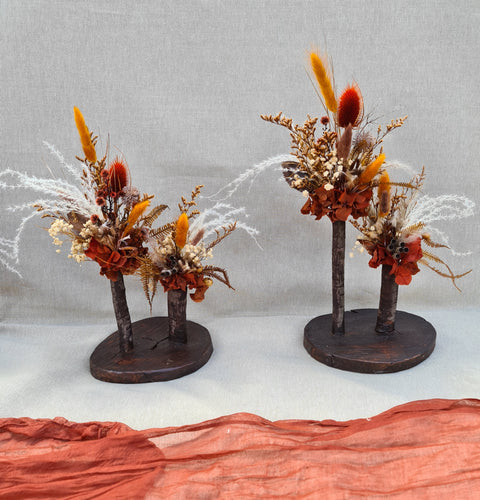 Wood round bud vases with rustic preserved flowers - HIRE ONLY