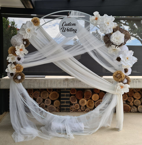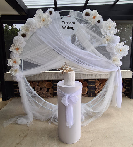 White double circle backdrop package w flowers and plinth - HIRE ONLY