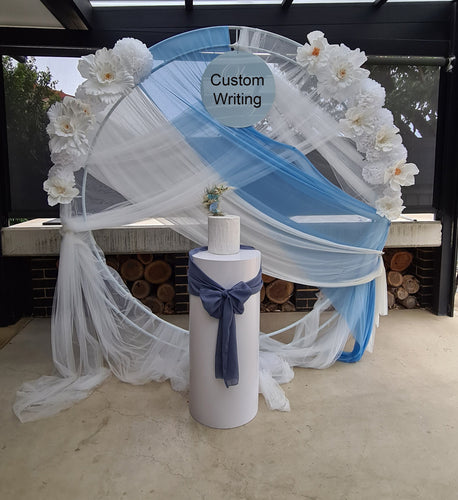 White & blue double circle backdrop package w flowers and plinth - HIRE ONLY
