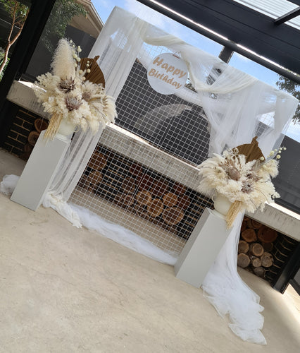 Boho urns & white mesh backdrop Birthday package - HIRE ONLY