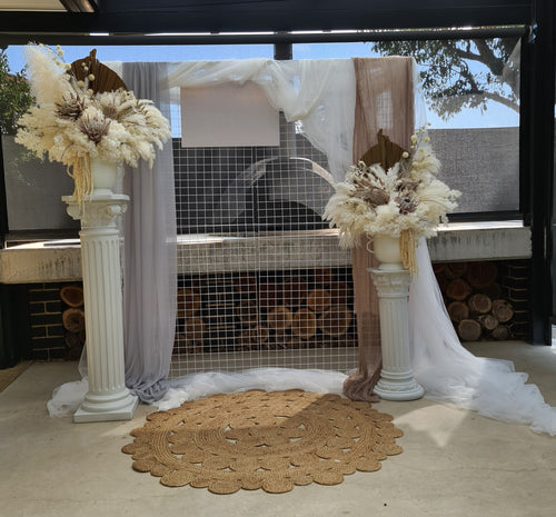 Boho urns & white mesh Roman columns - HIRE ONLY