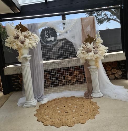 Boho urns & white mesh Roman columns Baby shower package - HIRE ONLY