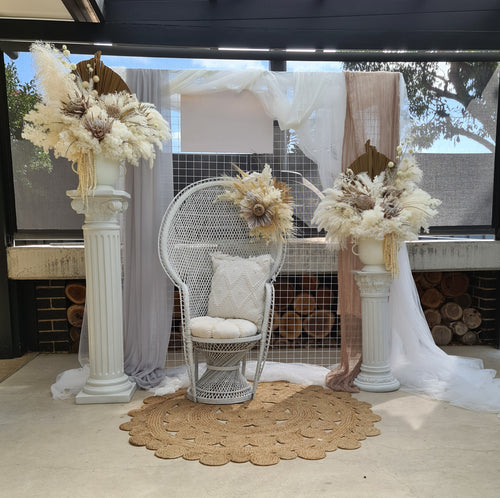 Boho urns & white mesh Roman columns & white peacock chair - HIRE ONLY