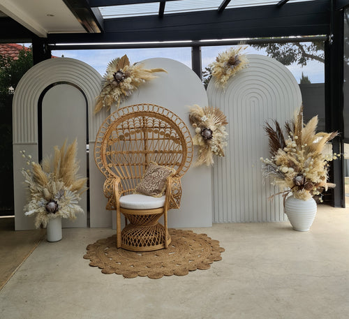 Two white backdrops / arches & 5 x boho flowers & Queen Peacock chair - HIRE ONLY