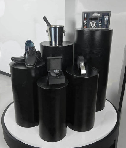 Grooms Preparation Room - Set of 5 Black leather look Cylinder Plinths - HIRE ONLY