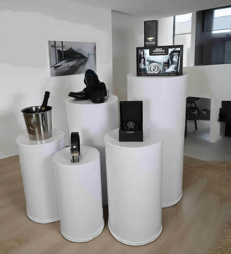 Grooms Preparation Room - Set of 5 White leather look Cylinder Plinths - HIRE ONLY