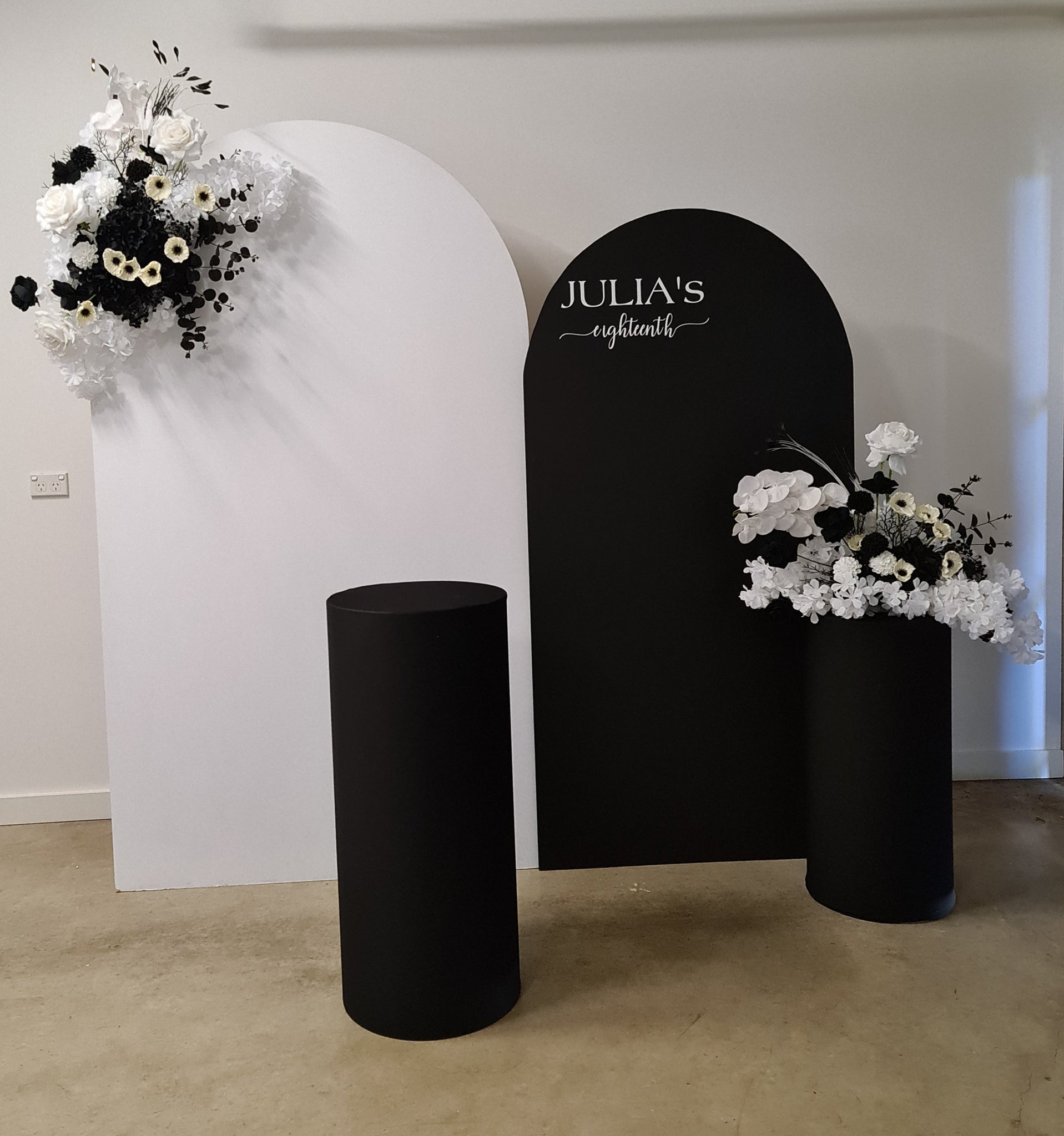 2 x arch backdrop (black & white), 2 x black & white flowers, 2 x cylinder plinths
