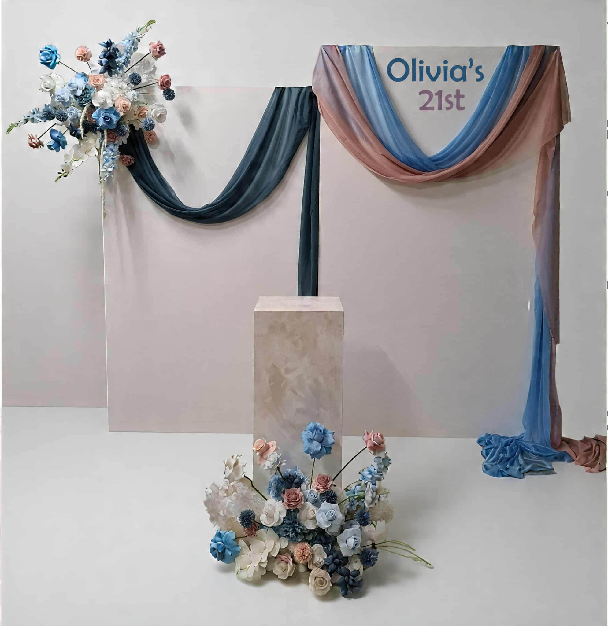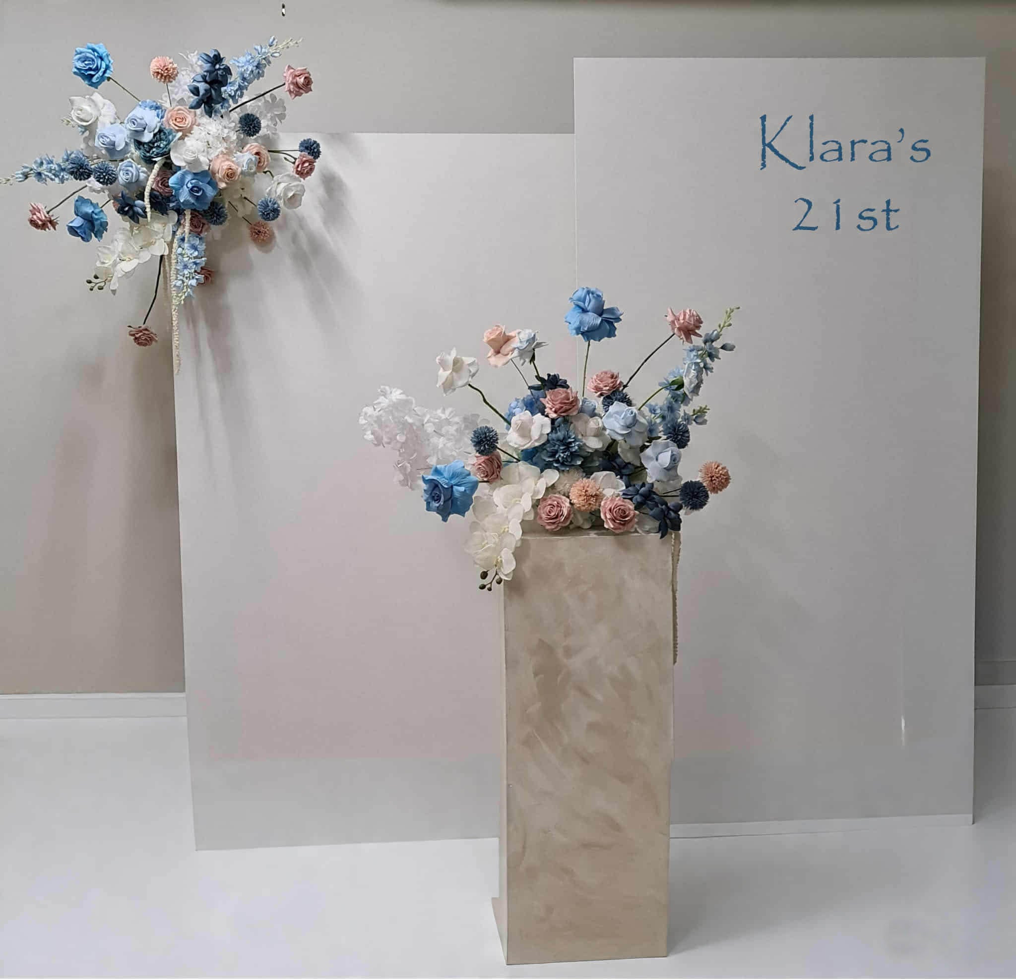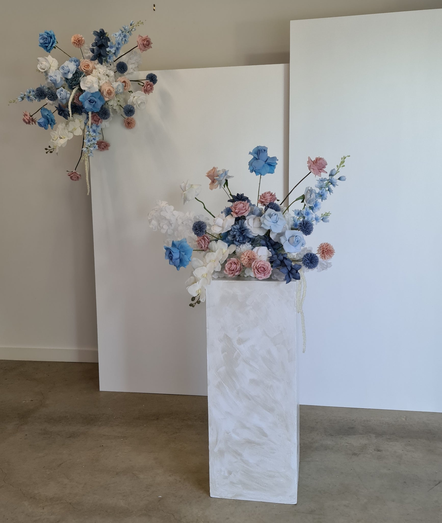 2 x rectangular backdrop, 2 x blue / pink flowers & cake stand