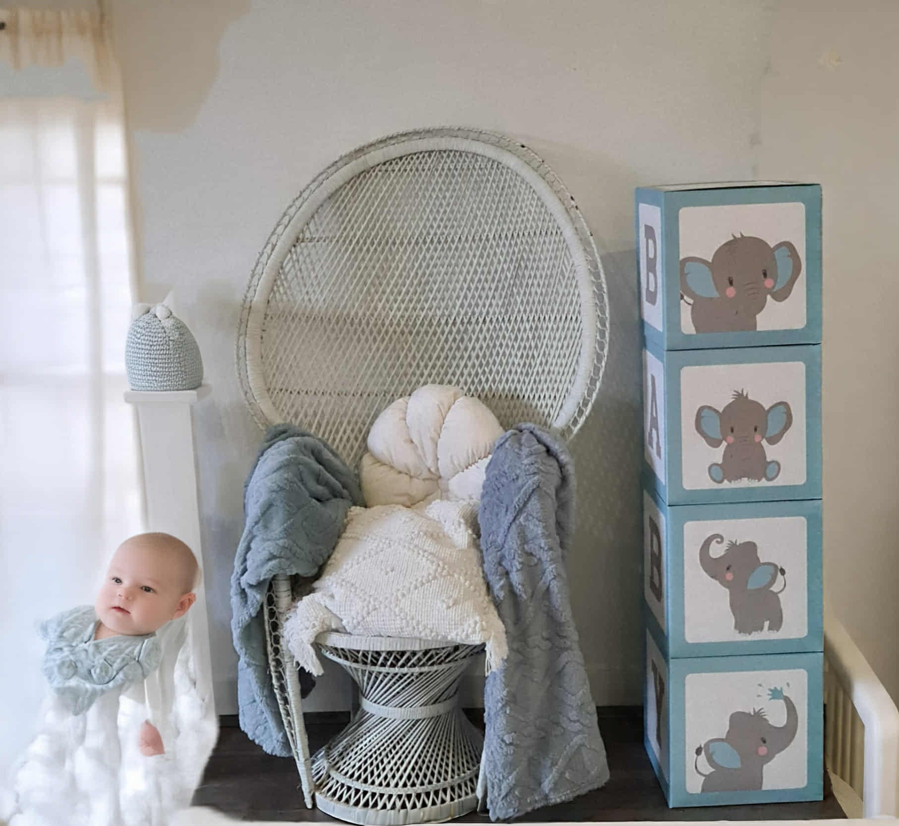- Solid blue & white boxes with BABY letters on one side and elephants on the other