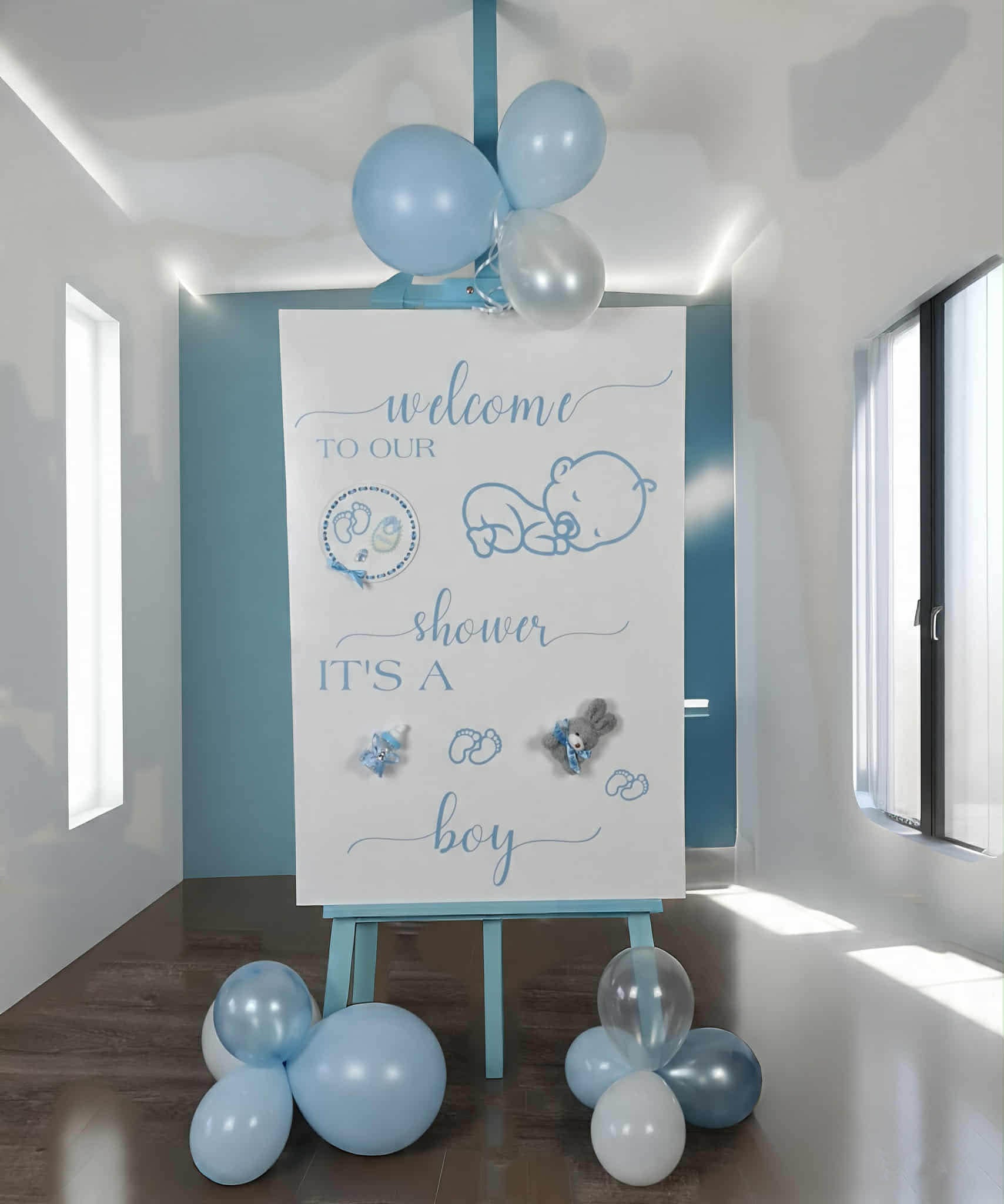 Baby shower – BABY BOY - blue welcome sign (easel, board & balloons)