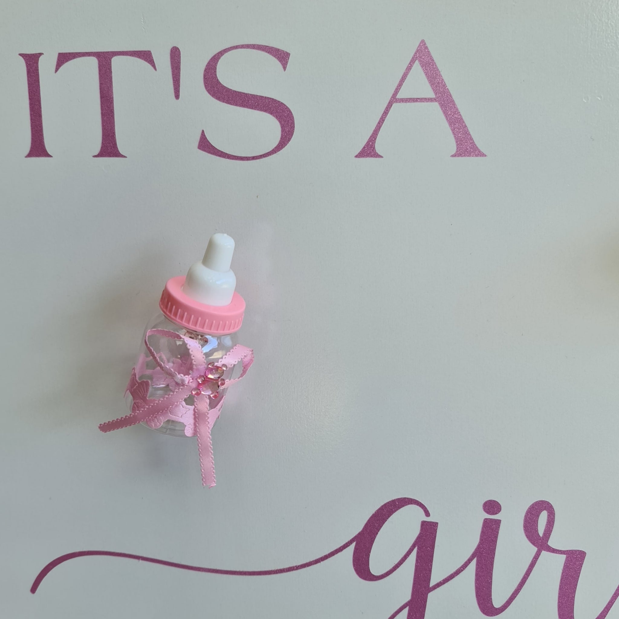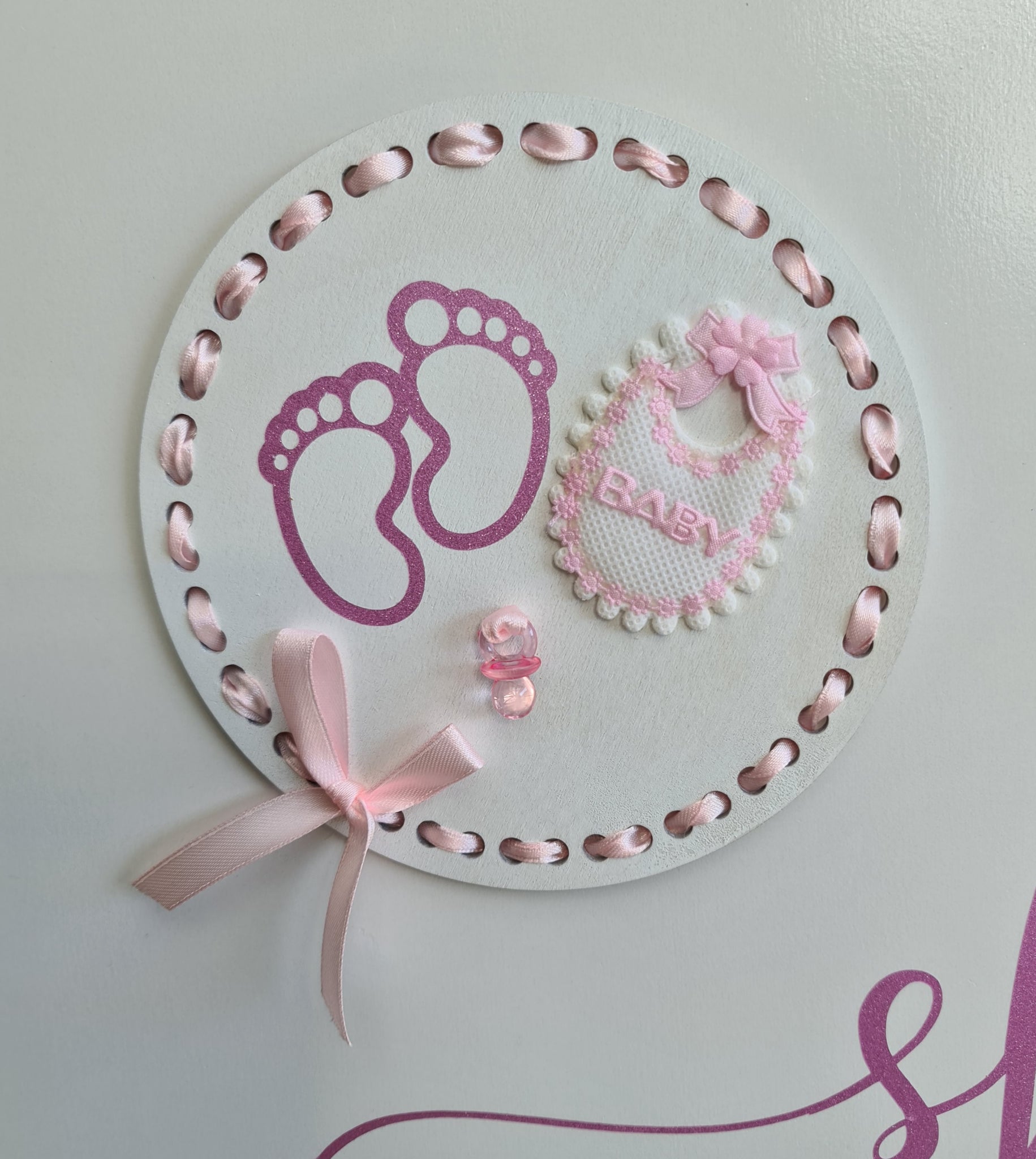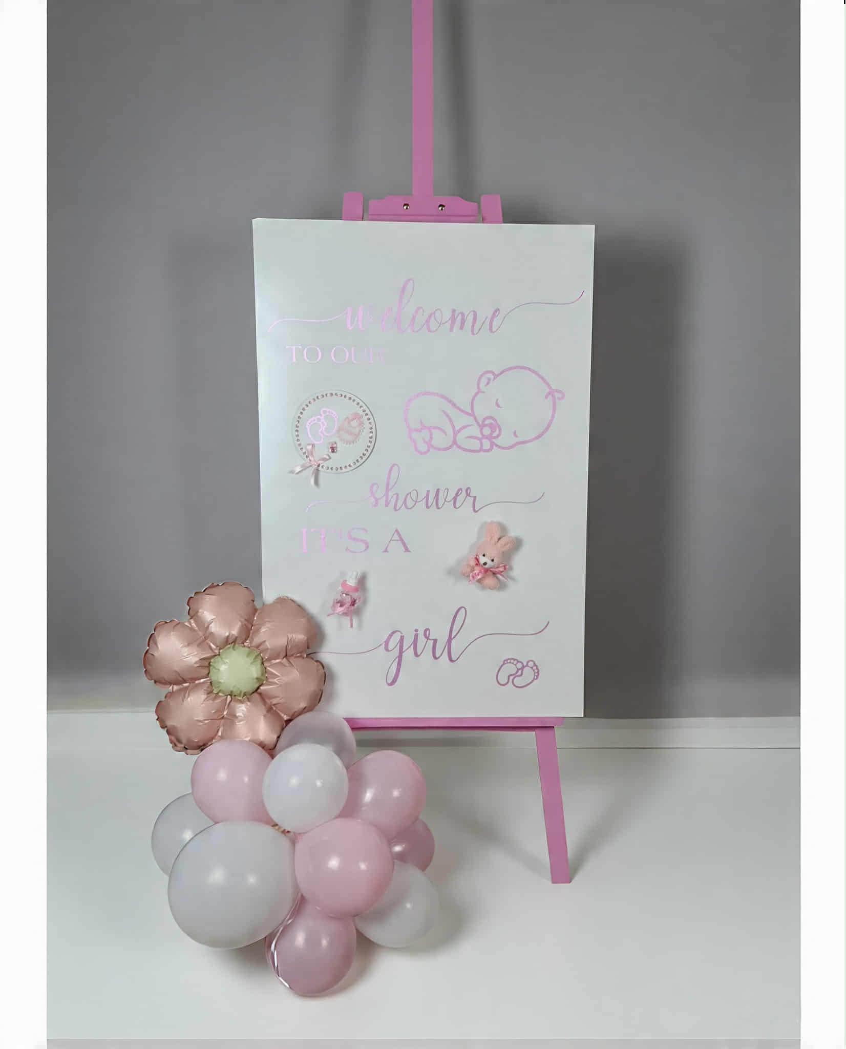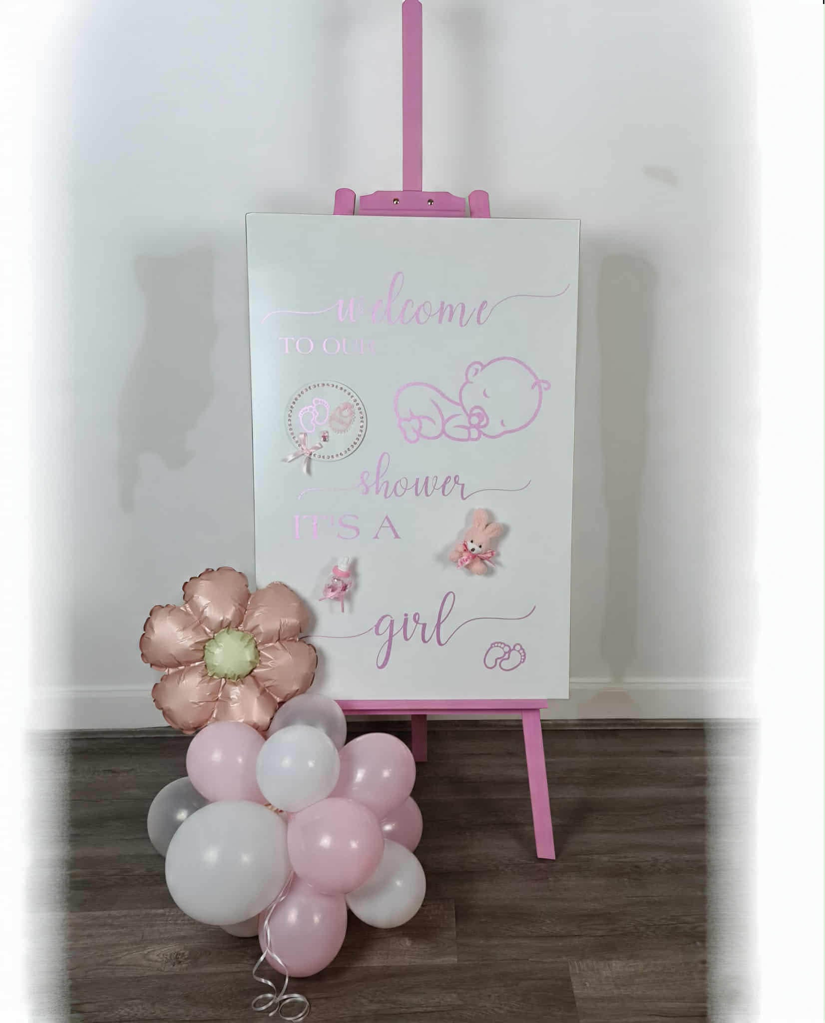 Baby shower – BABY GIRL - pink welcome sign (easel, board & balloons)