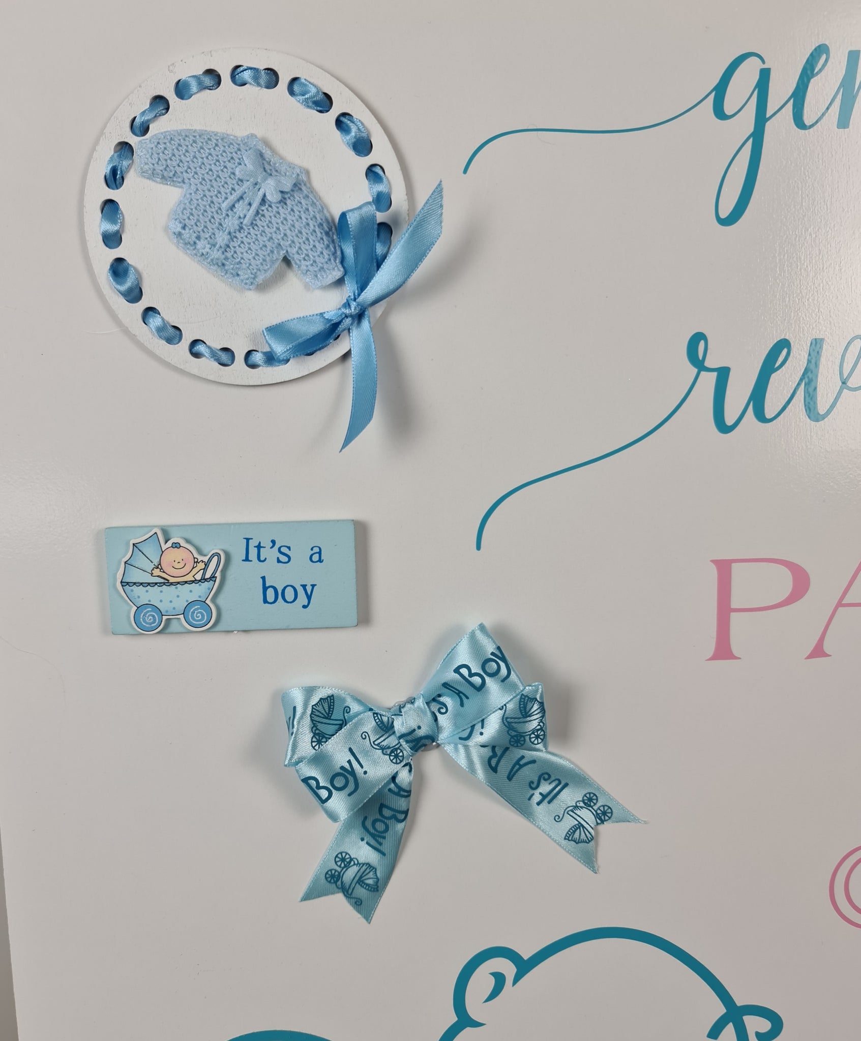 Baby shower – GENDER REVEAL – blue / pink welcome sign (easel, board & balloons)
