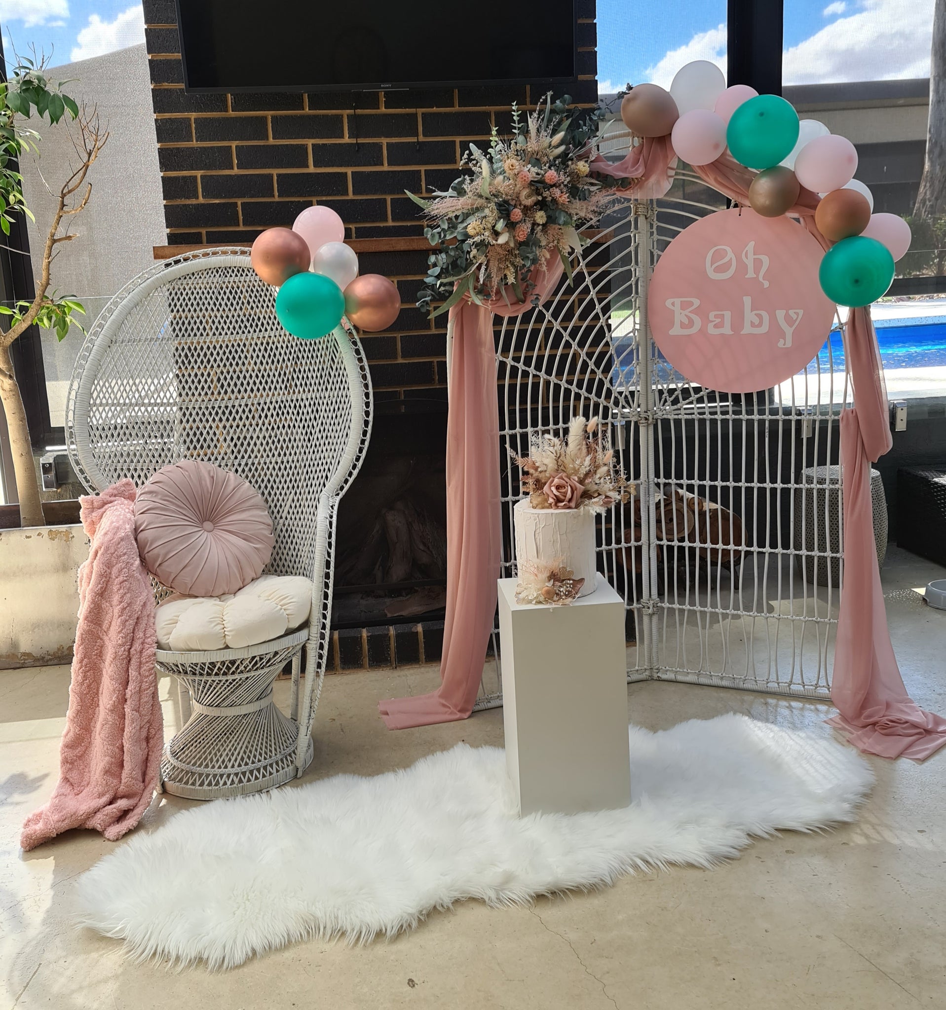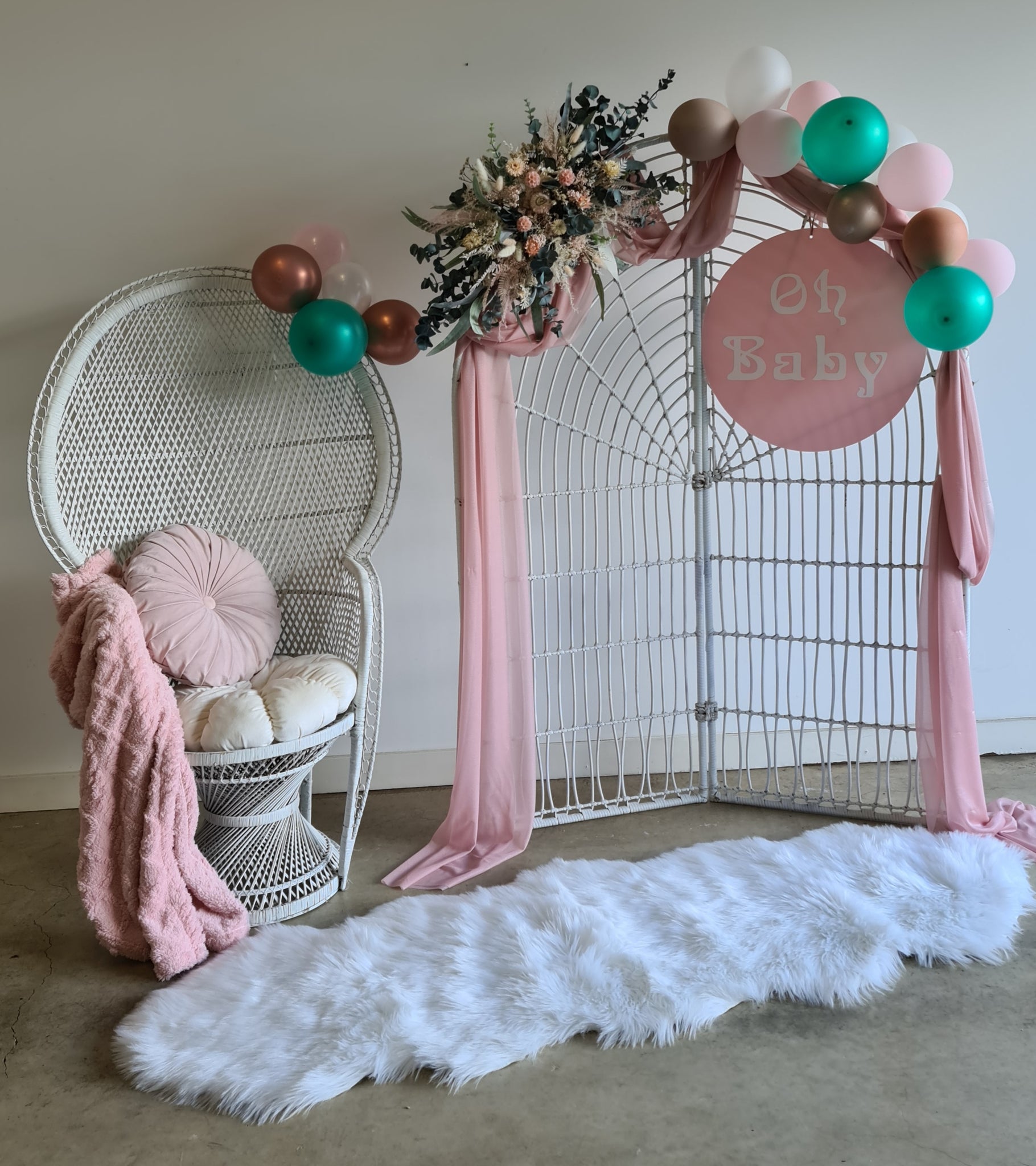 Baby shower pink/green package - white backdrop, peacock chair & flowers