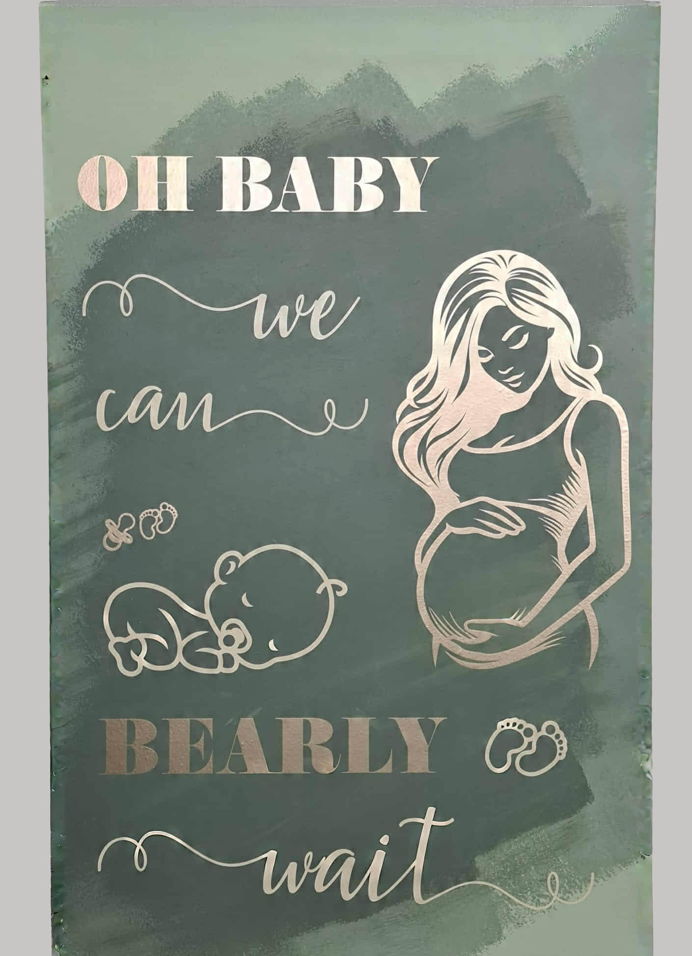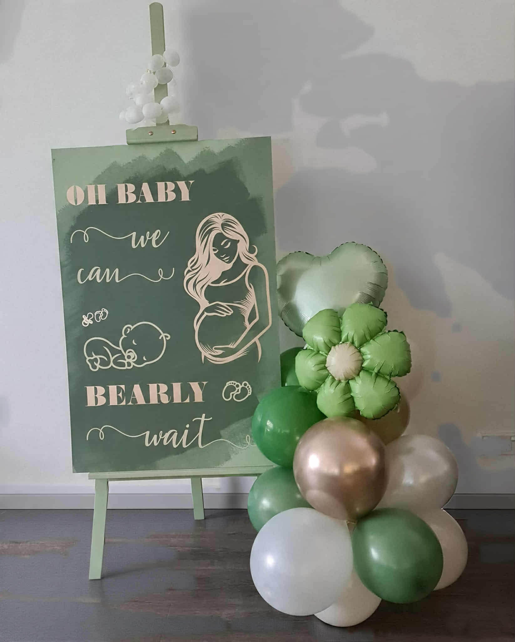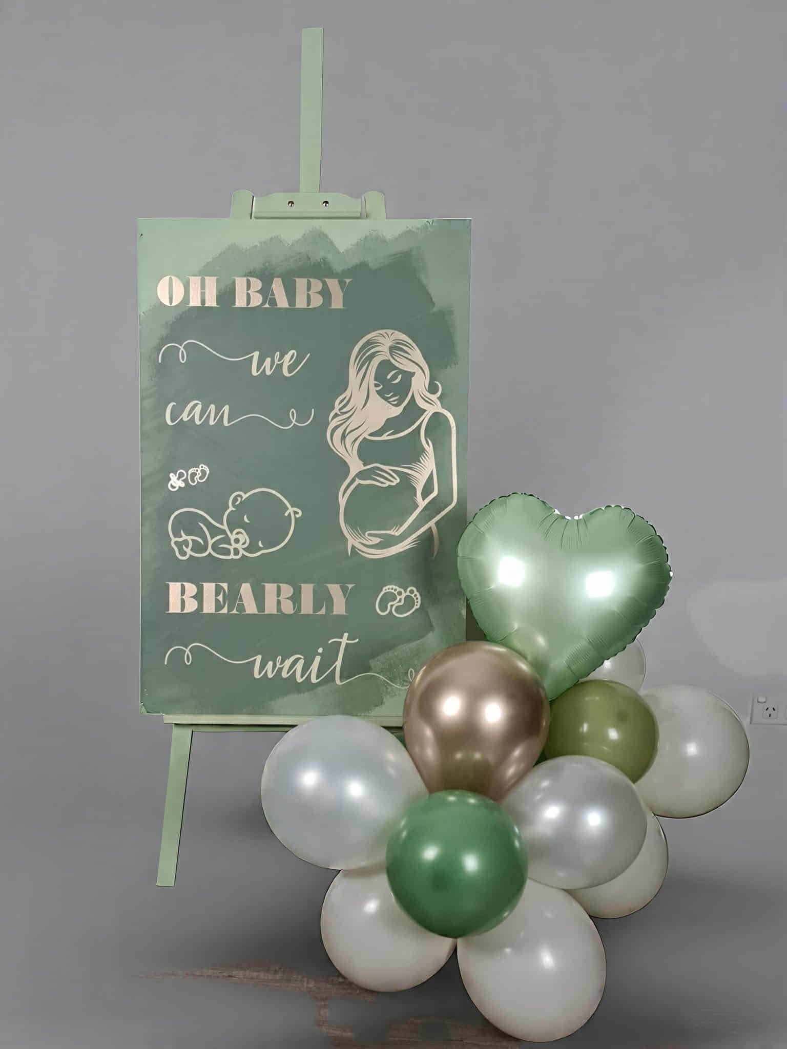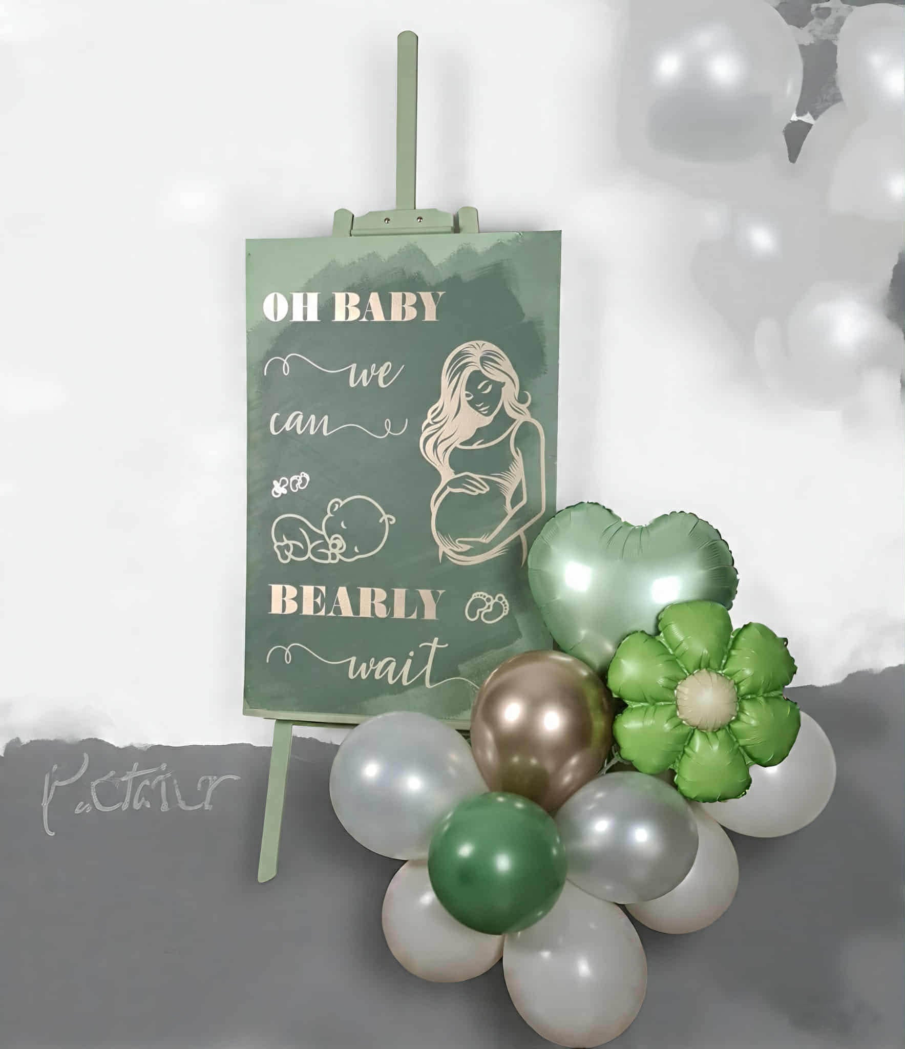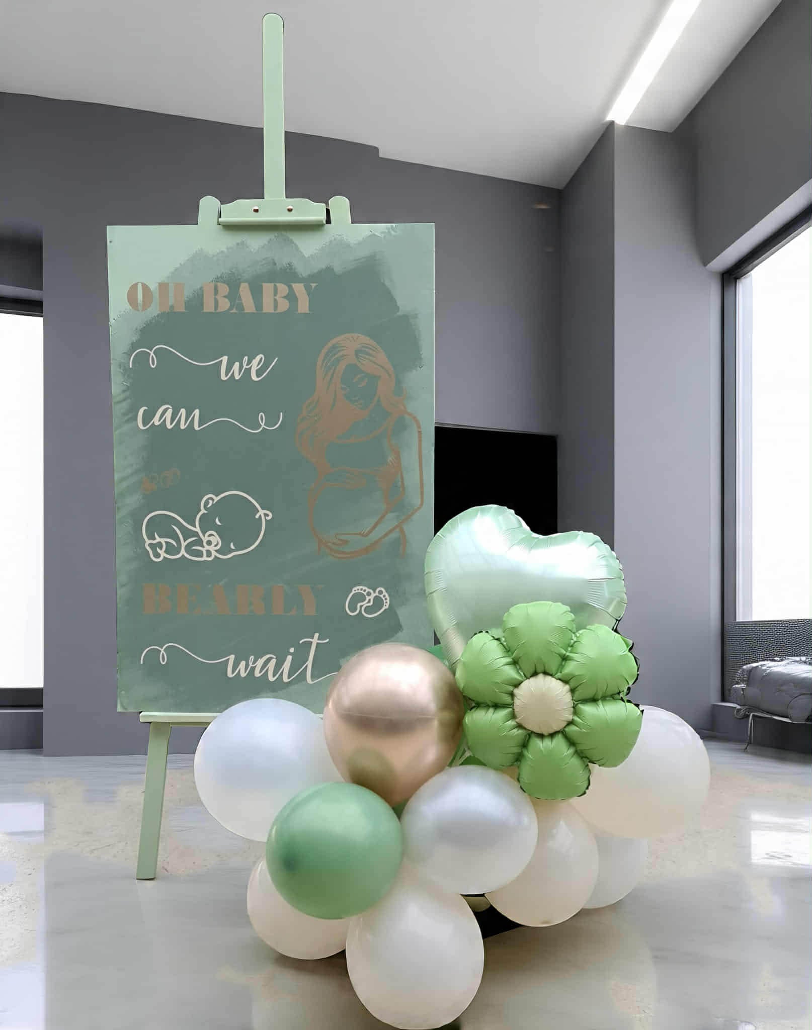 Baby shower – sage, green, neutral & champagne gold welcome sign (easel, board & balloons)