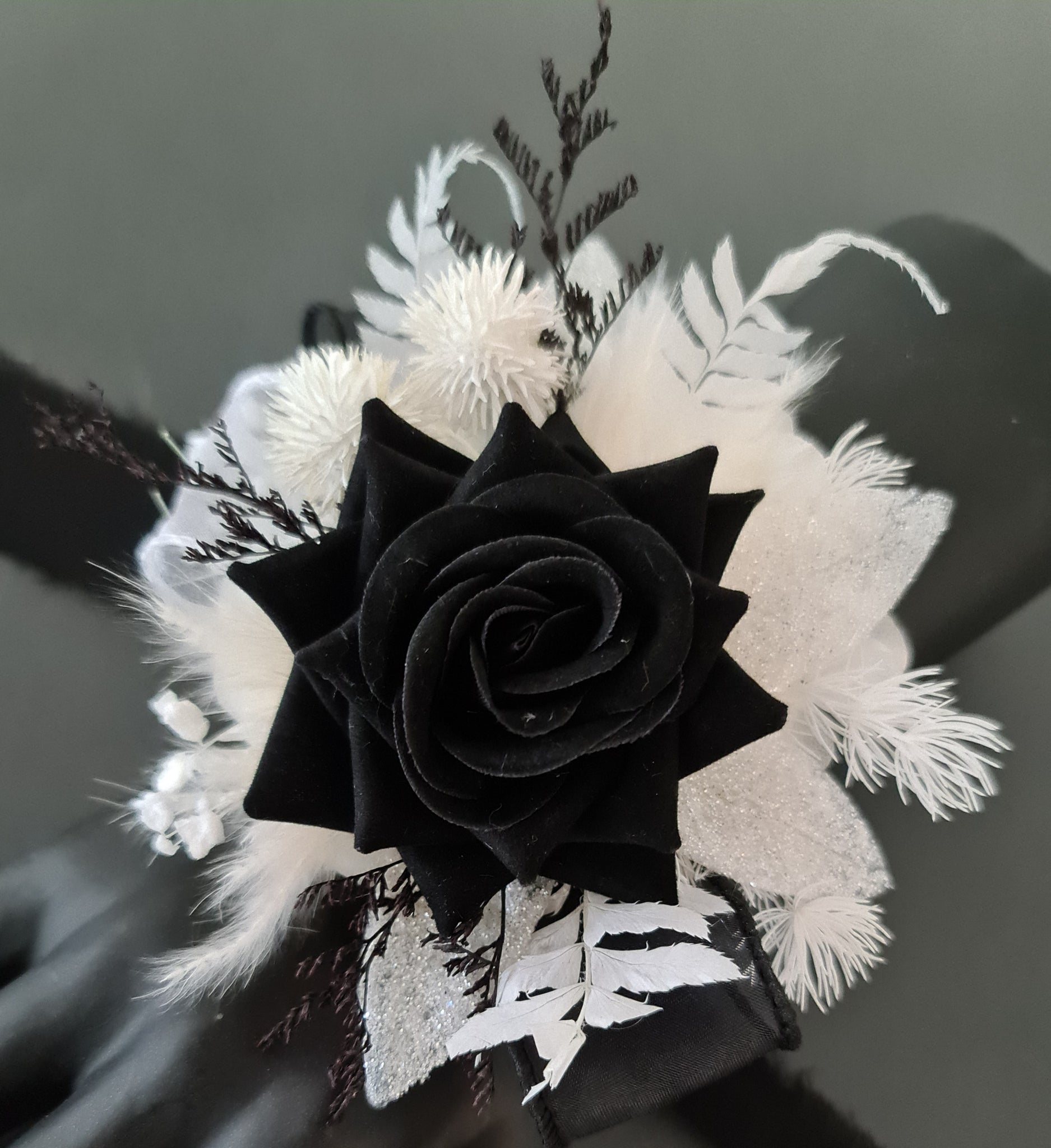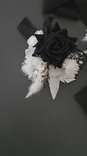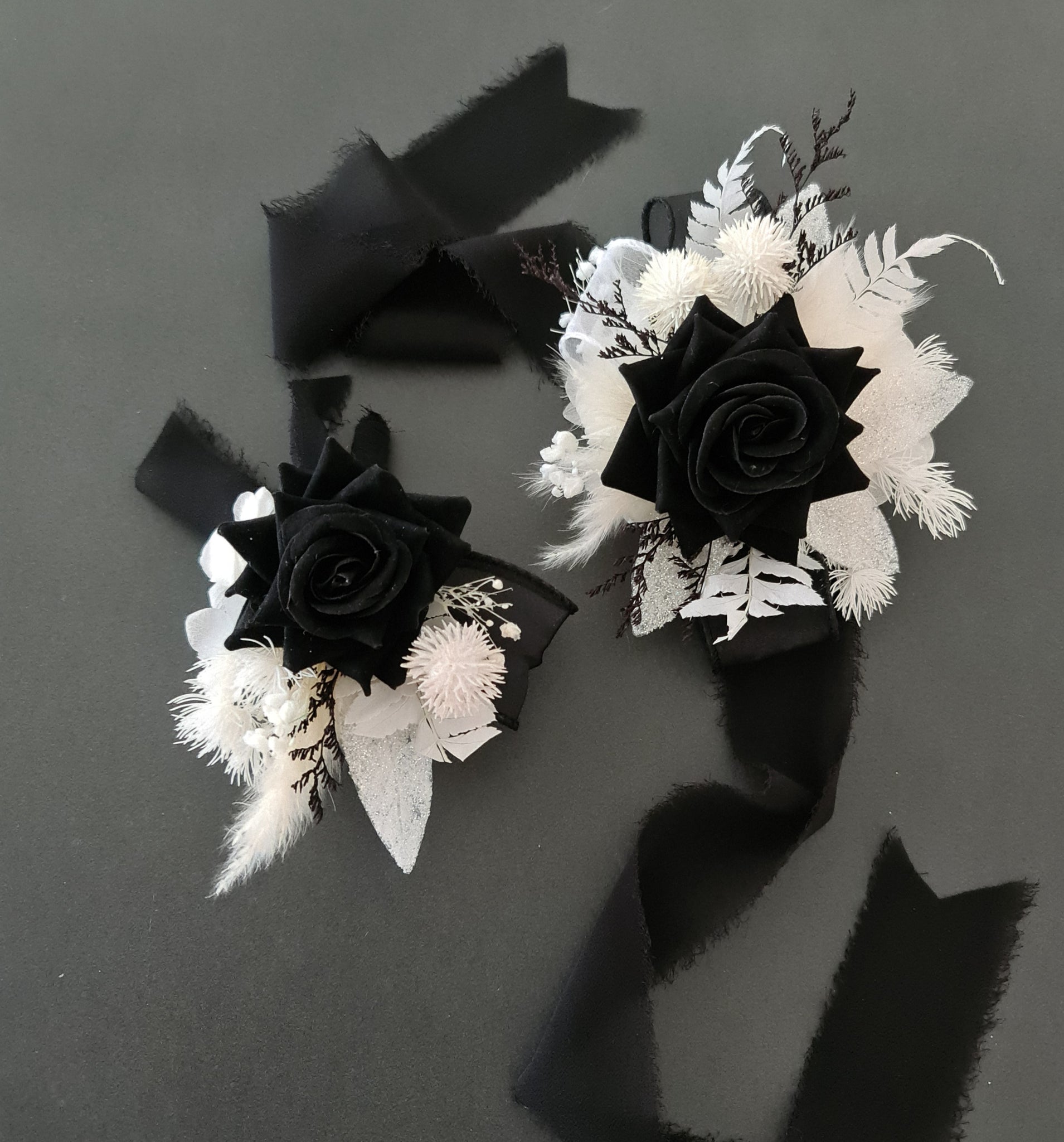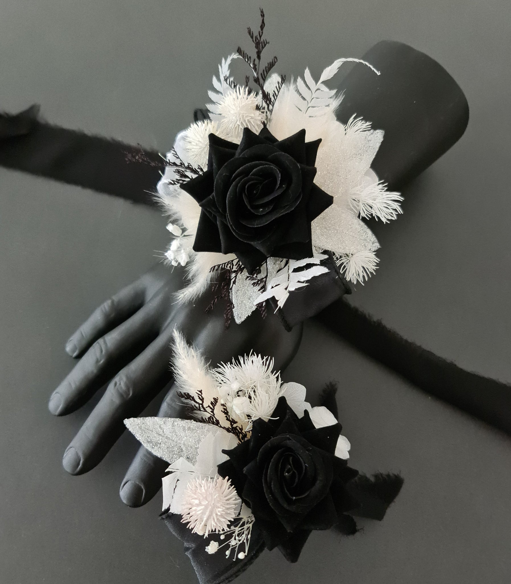 Black & white everlasting flowers corsage & boutonniere set; combination of preserved flowers with black velvet roses