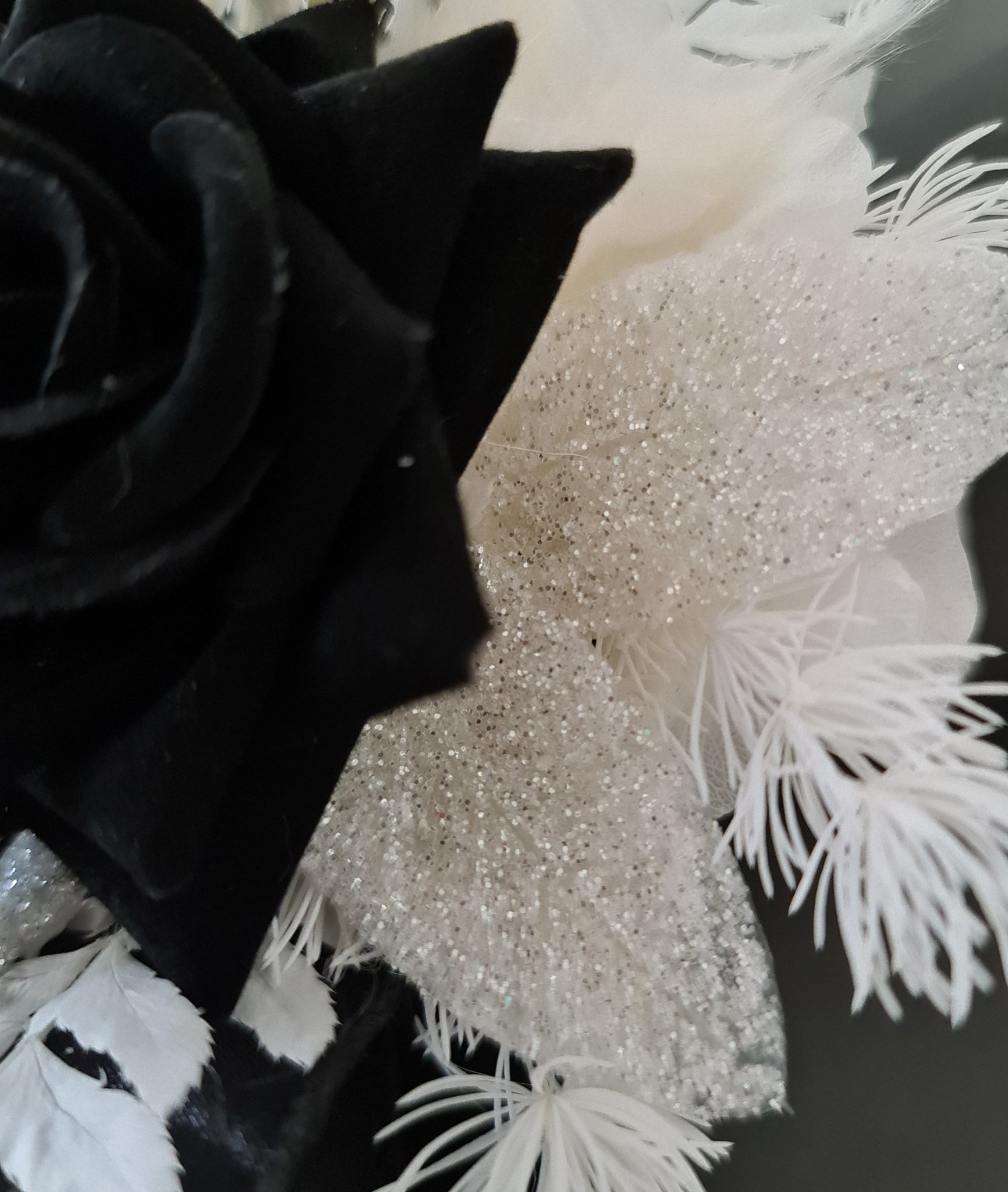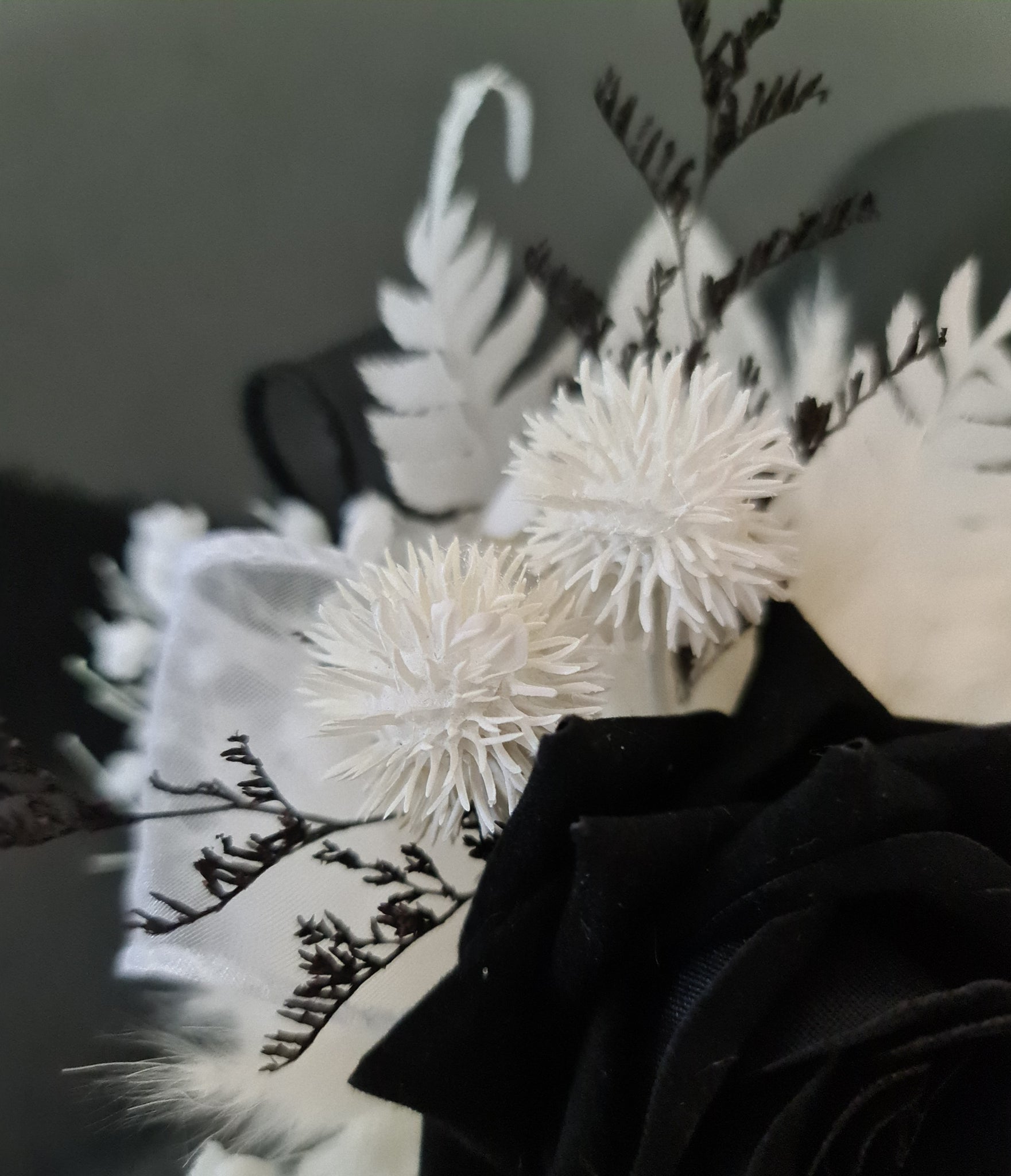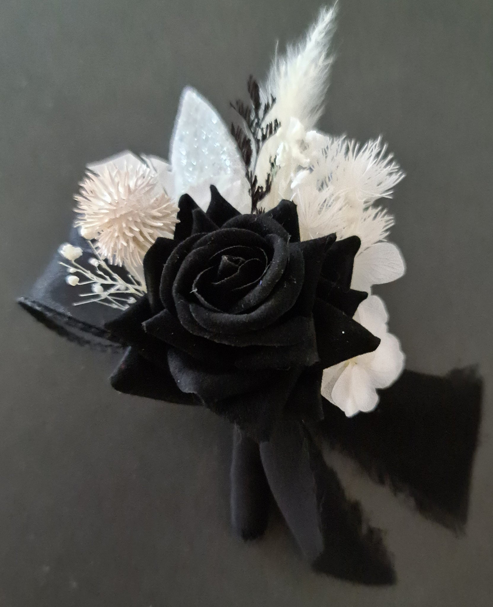 Black & white everlasting flowers corsage & boutonniere set; combination of preserved flowers with black velvet roses