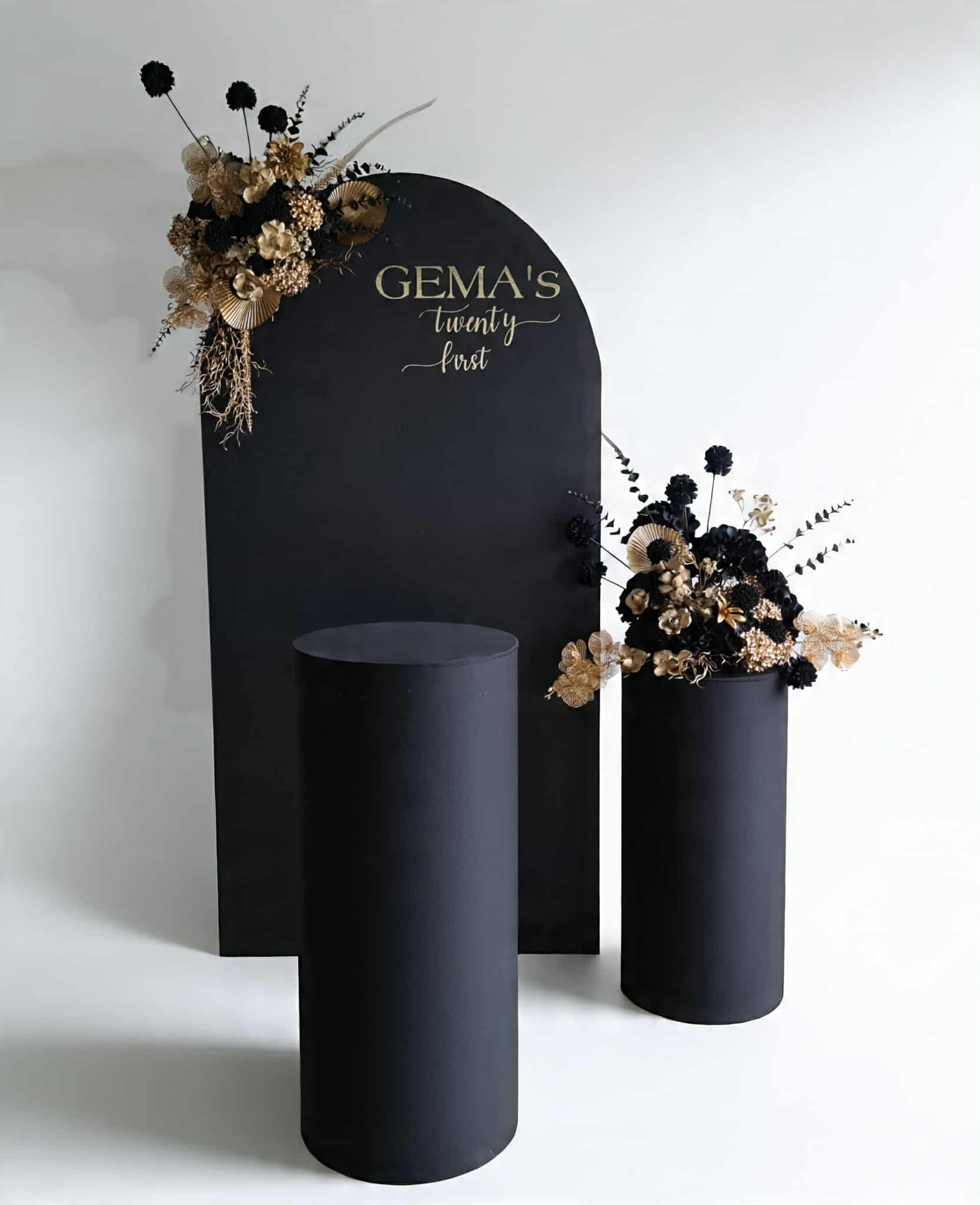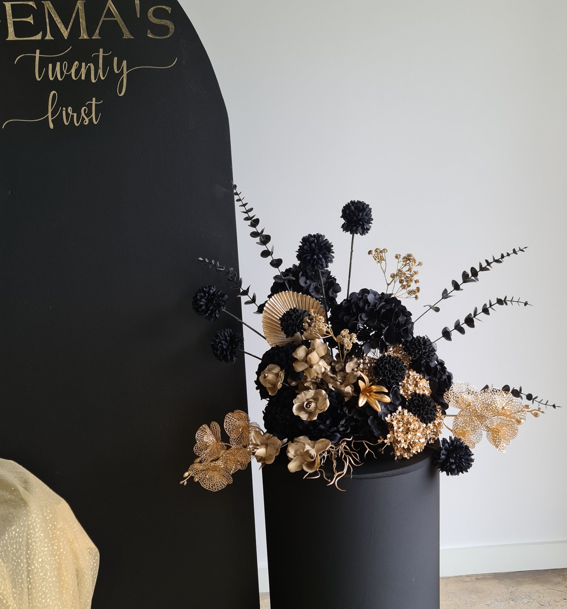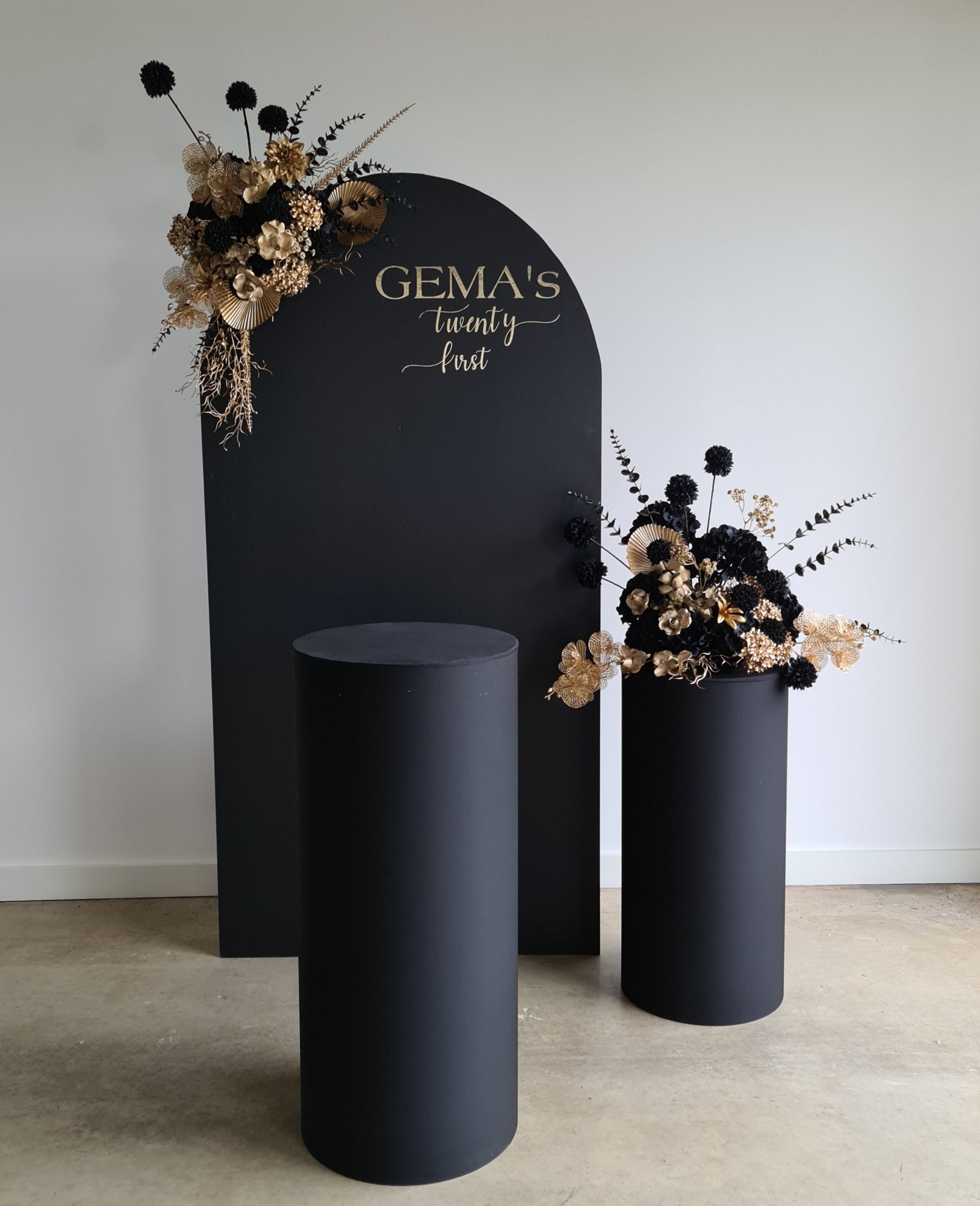 Black arch backdrop, 2 x black & gold flowers & 2 x black plinths
