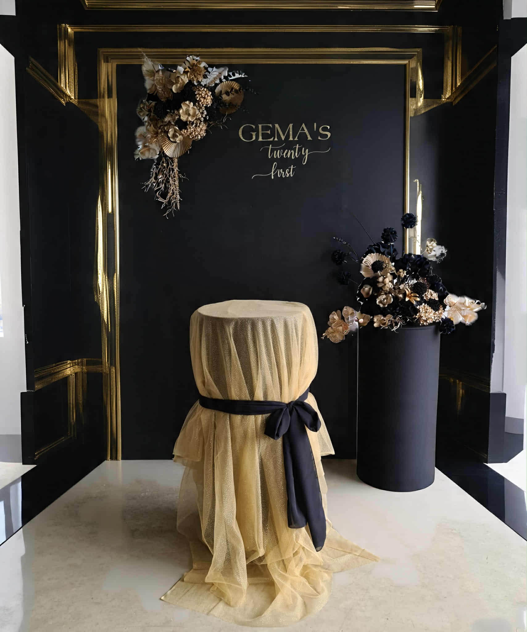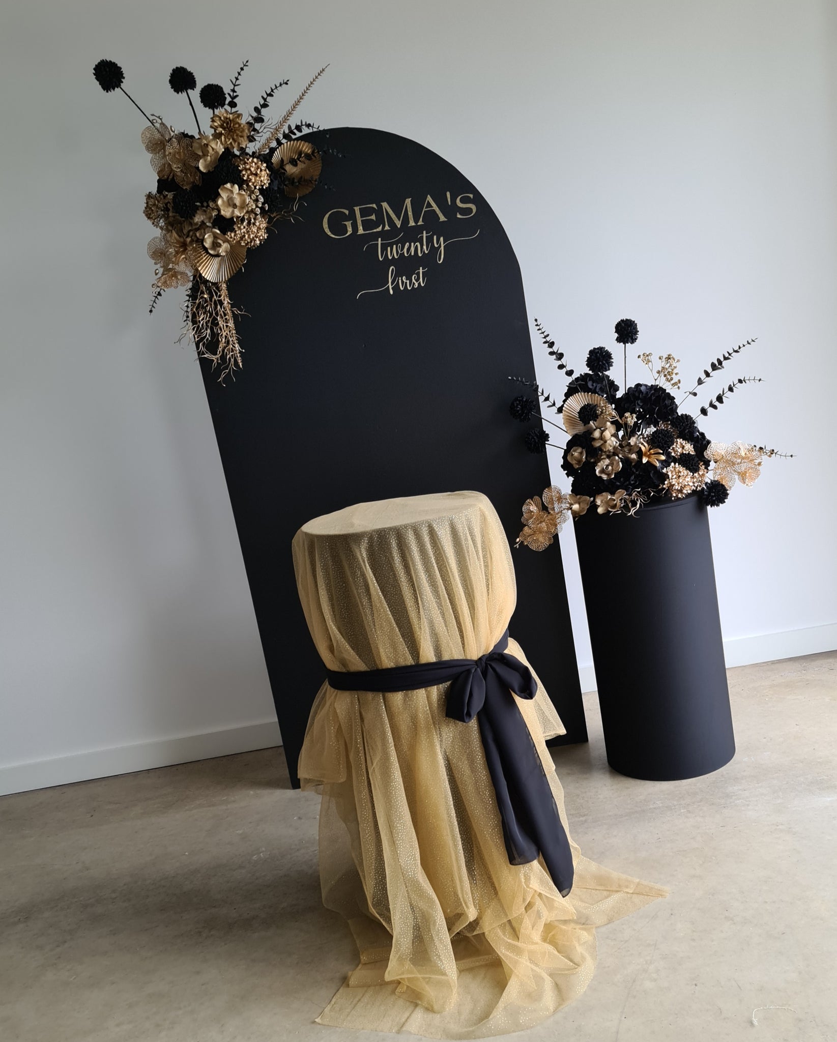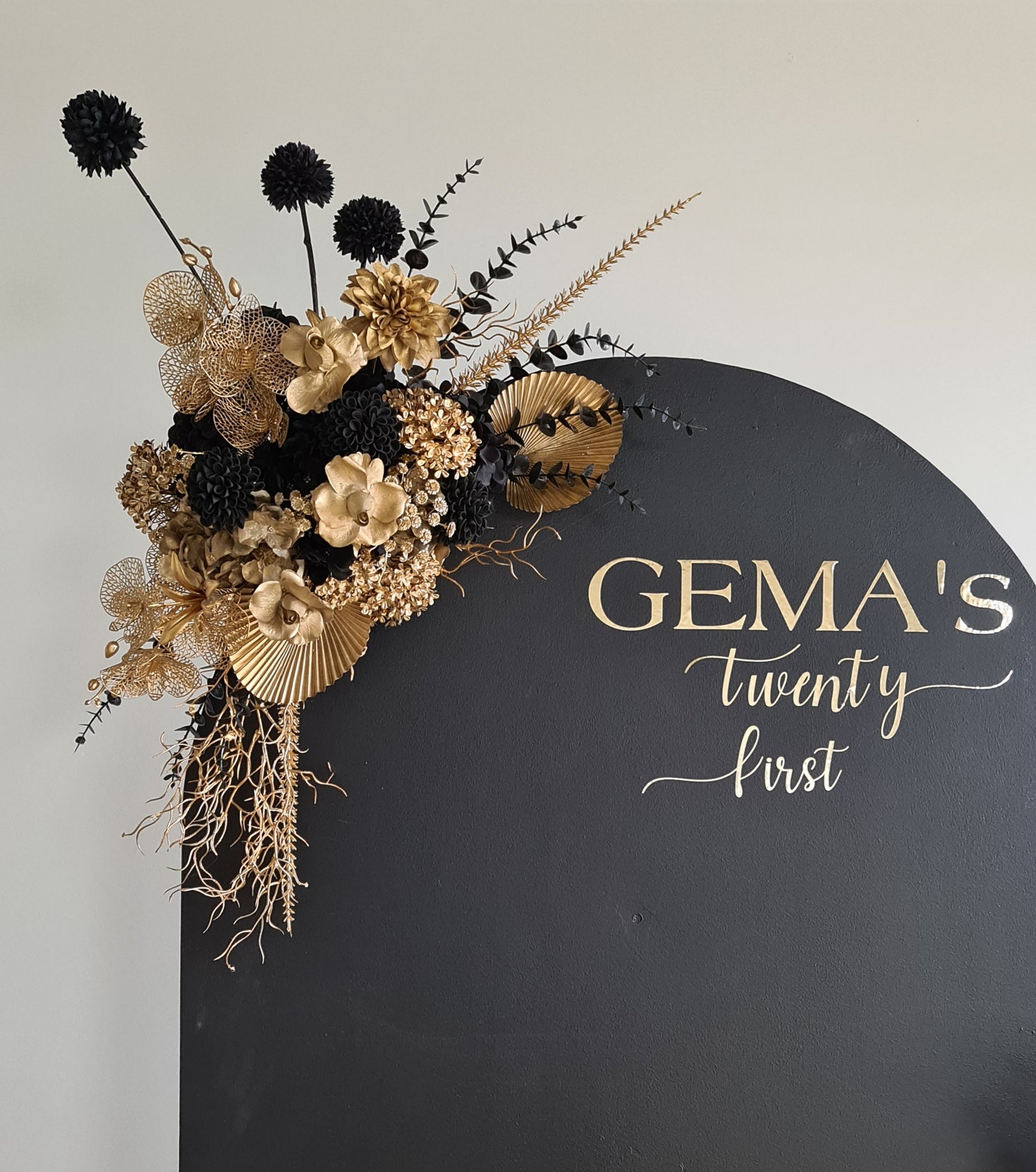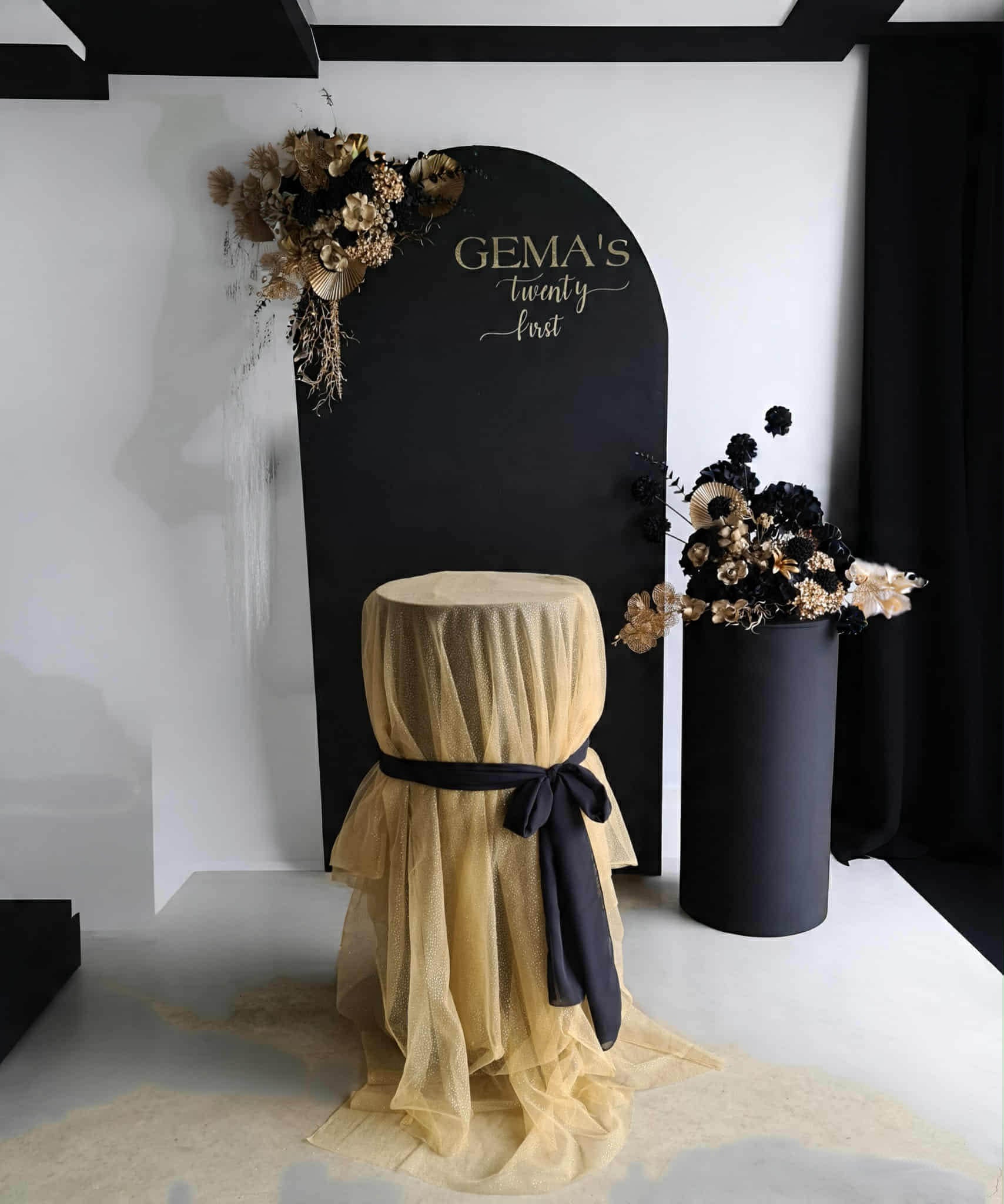 Black arch backdrop, 2 x black & gold flowers & 2 x black plinths