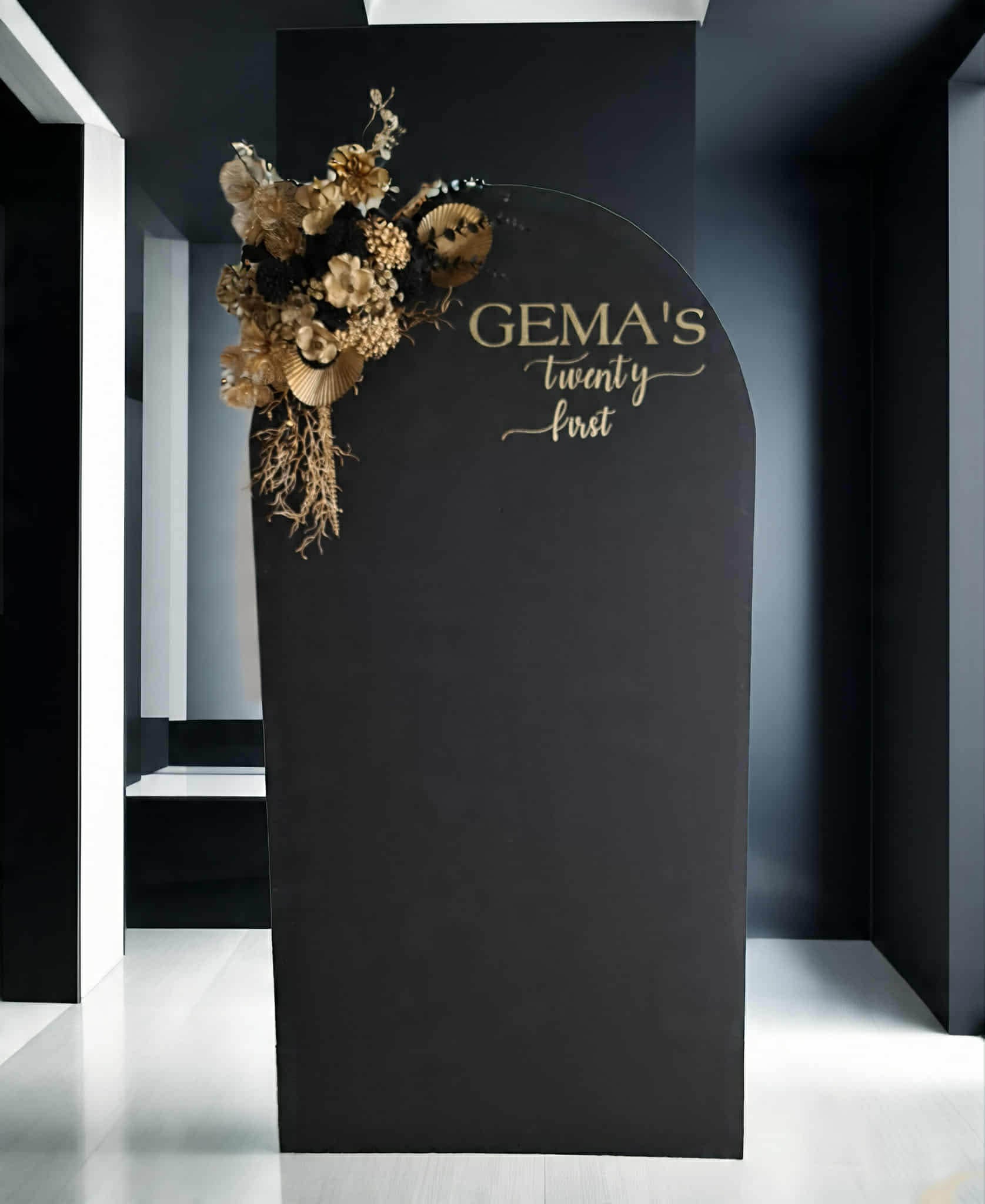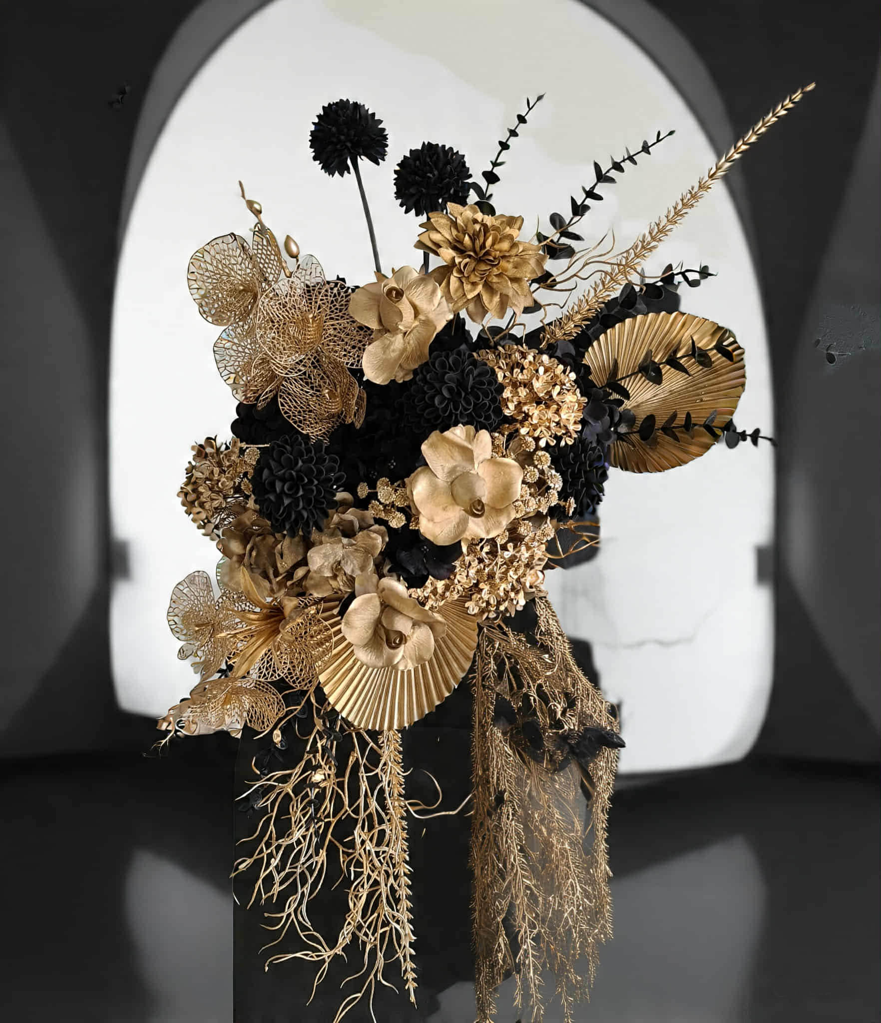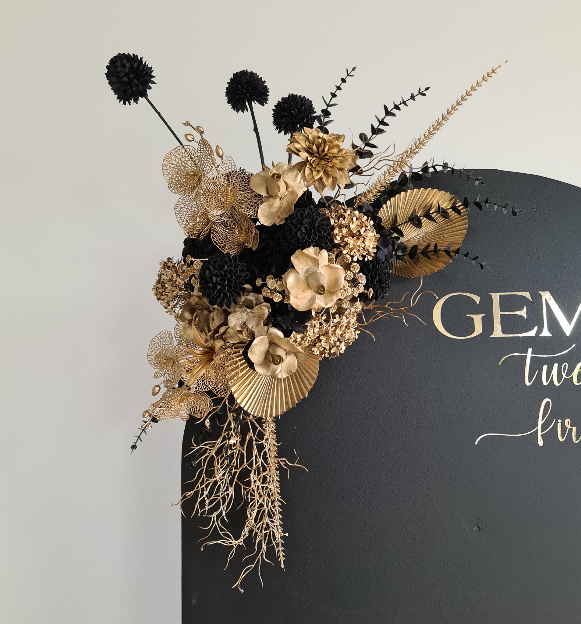 Black arch backdrop and black & gold flowers