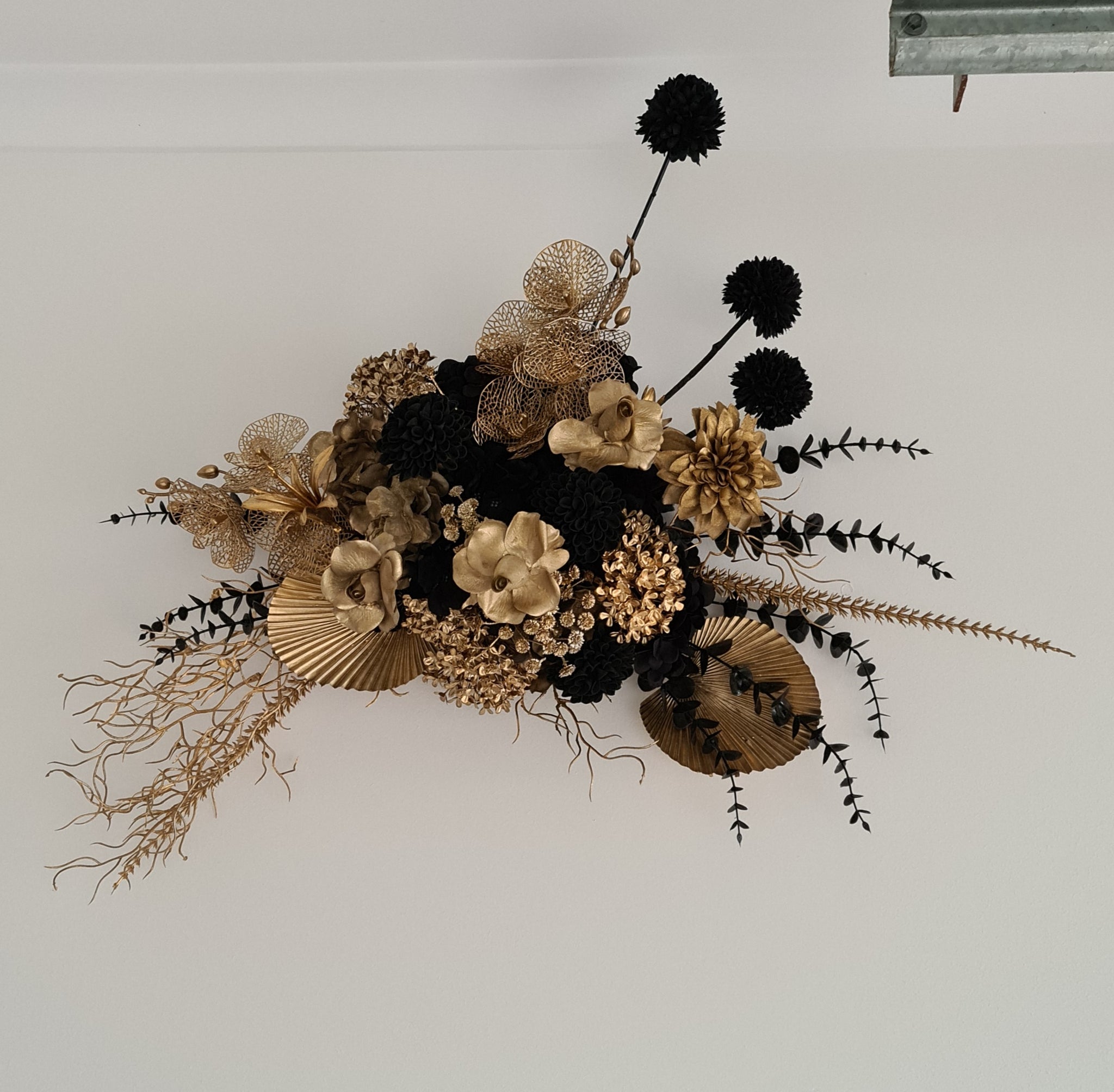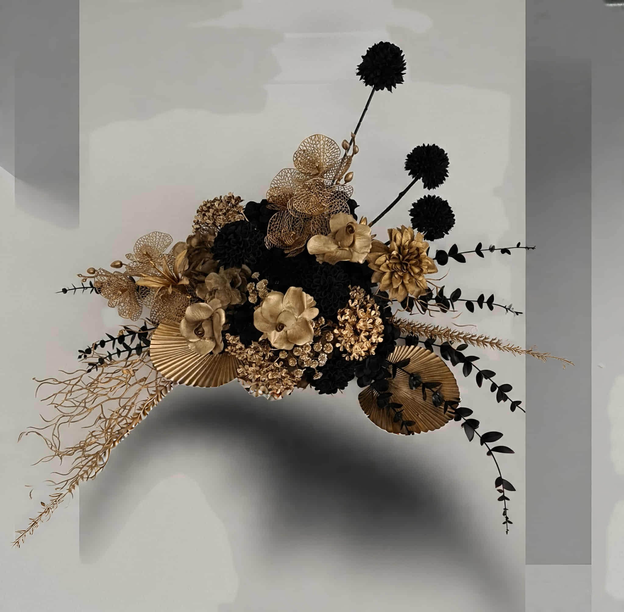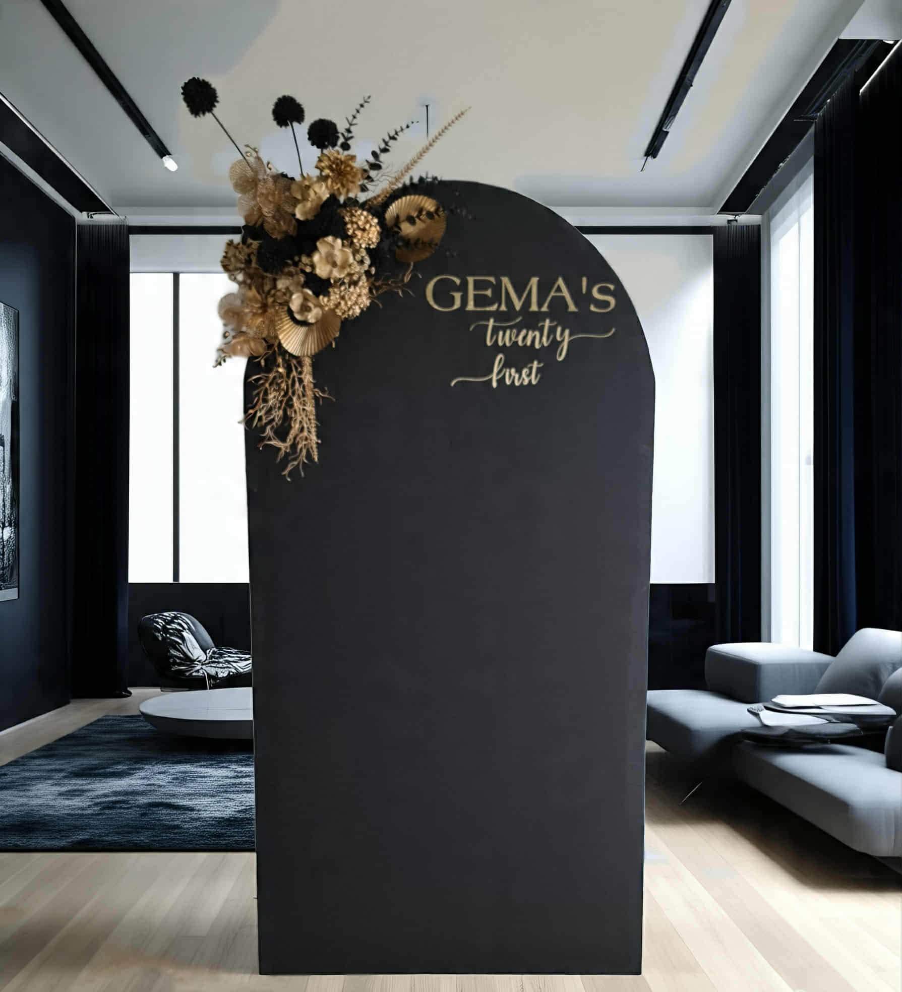 Black arch backdrop and black & gold flowers