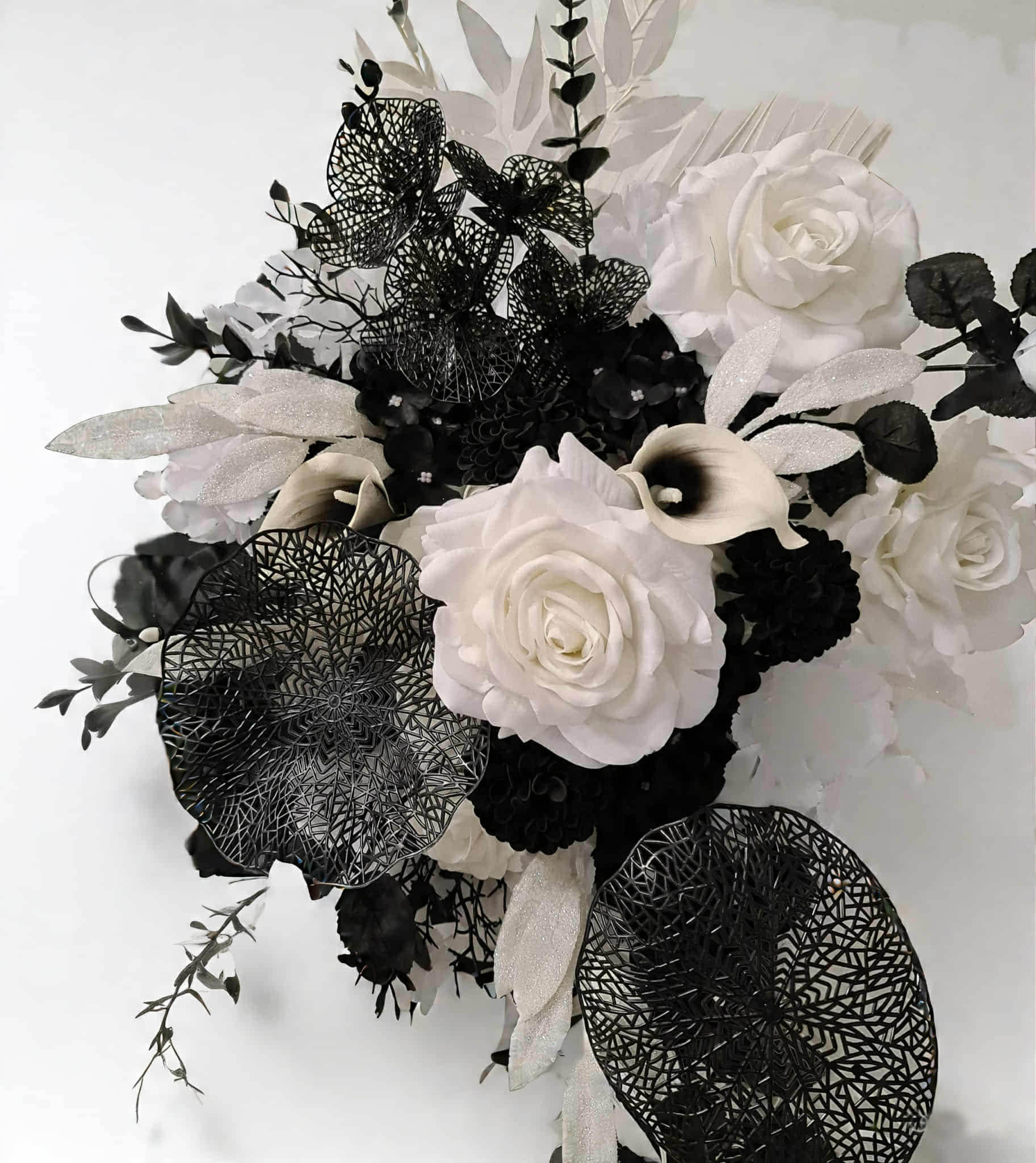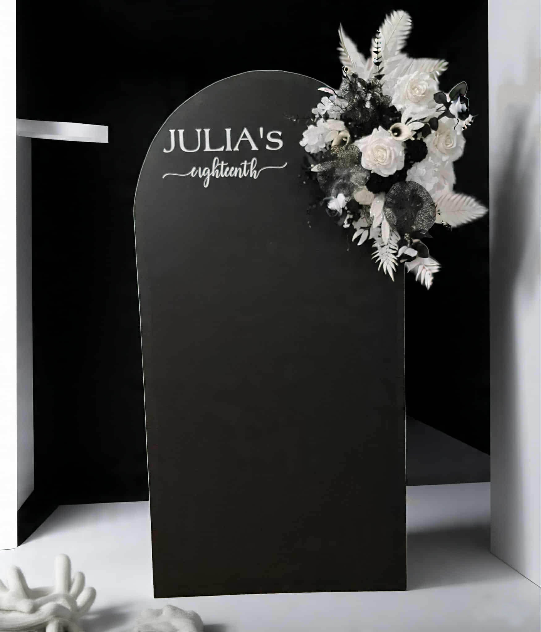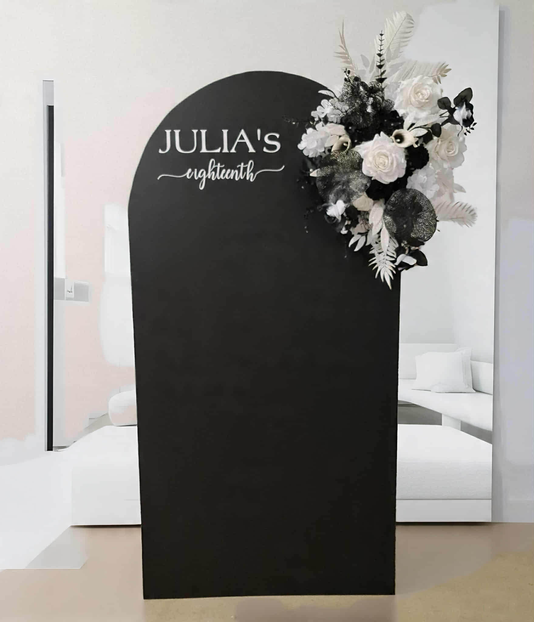 Black arch / backdrop and black & white flowers