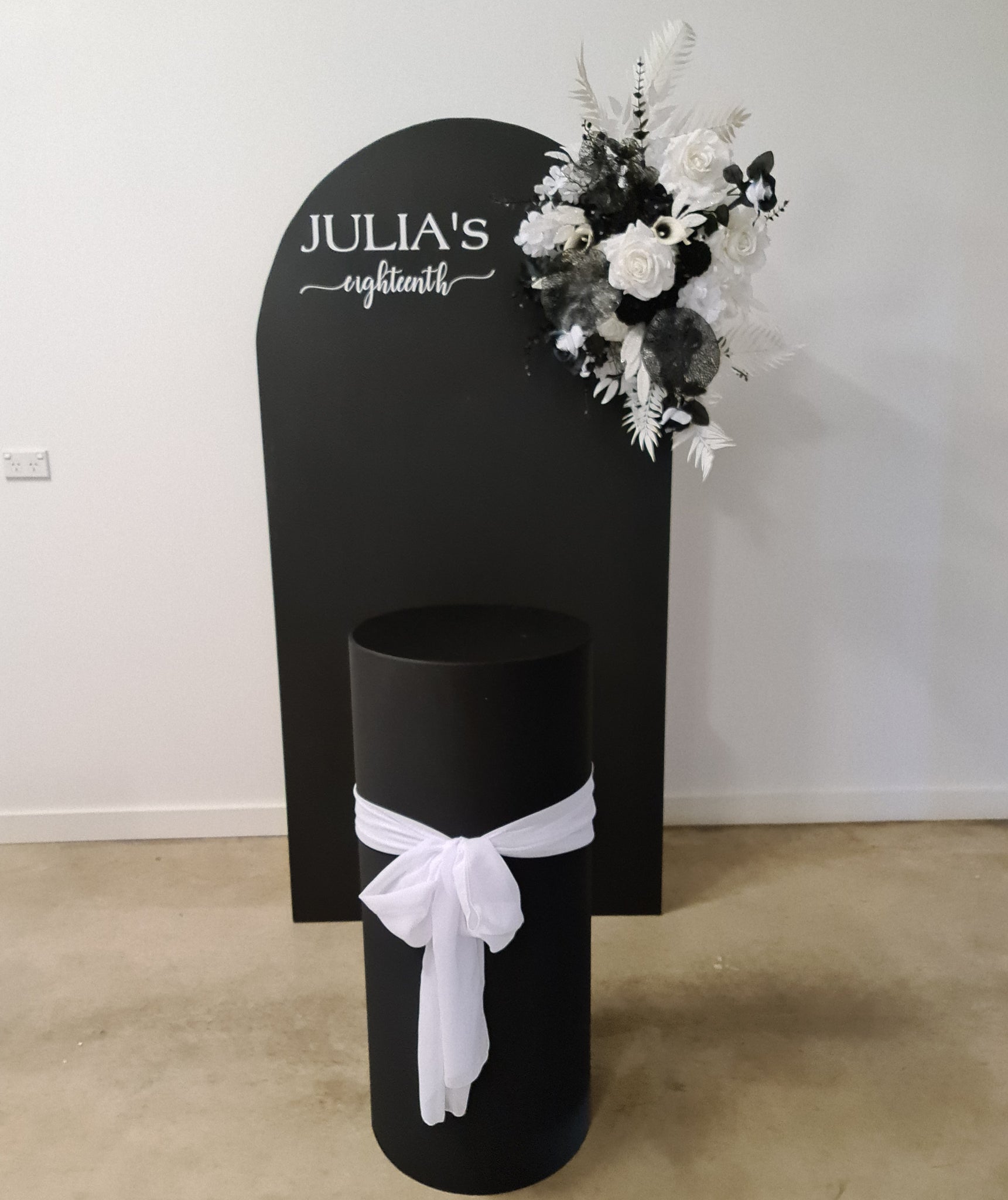 Black arch backdrop, Black & white flowers and black plinth / cake stand