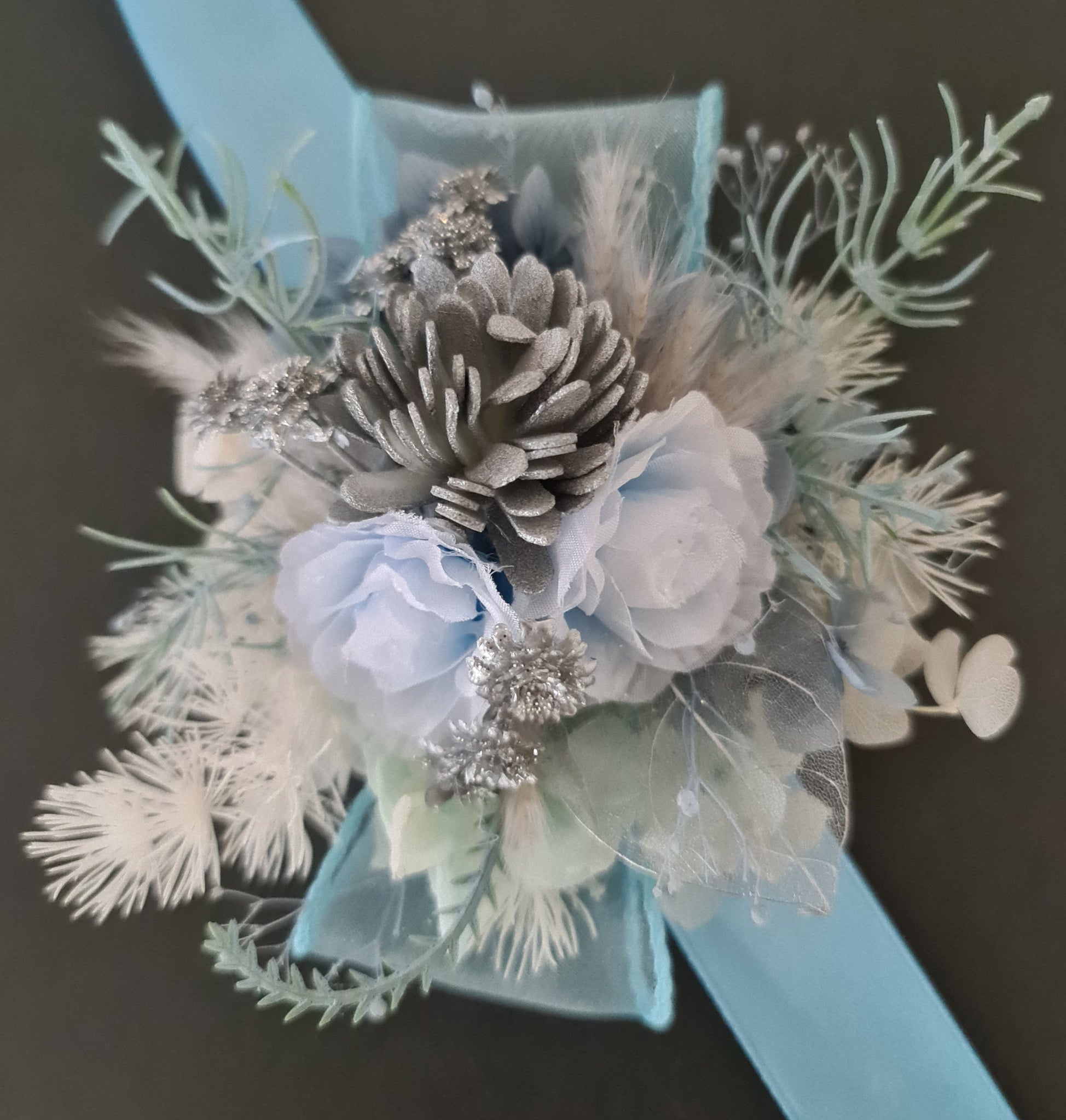 Blush blue & silver everlasting flowers corsage – school formal, prom, wedding
