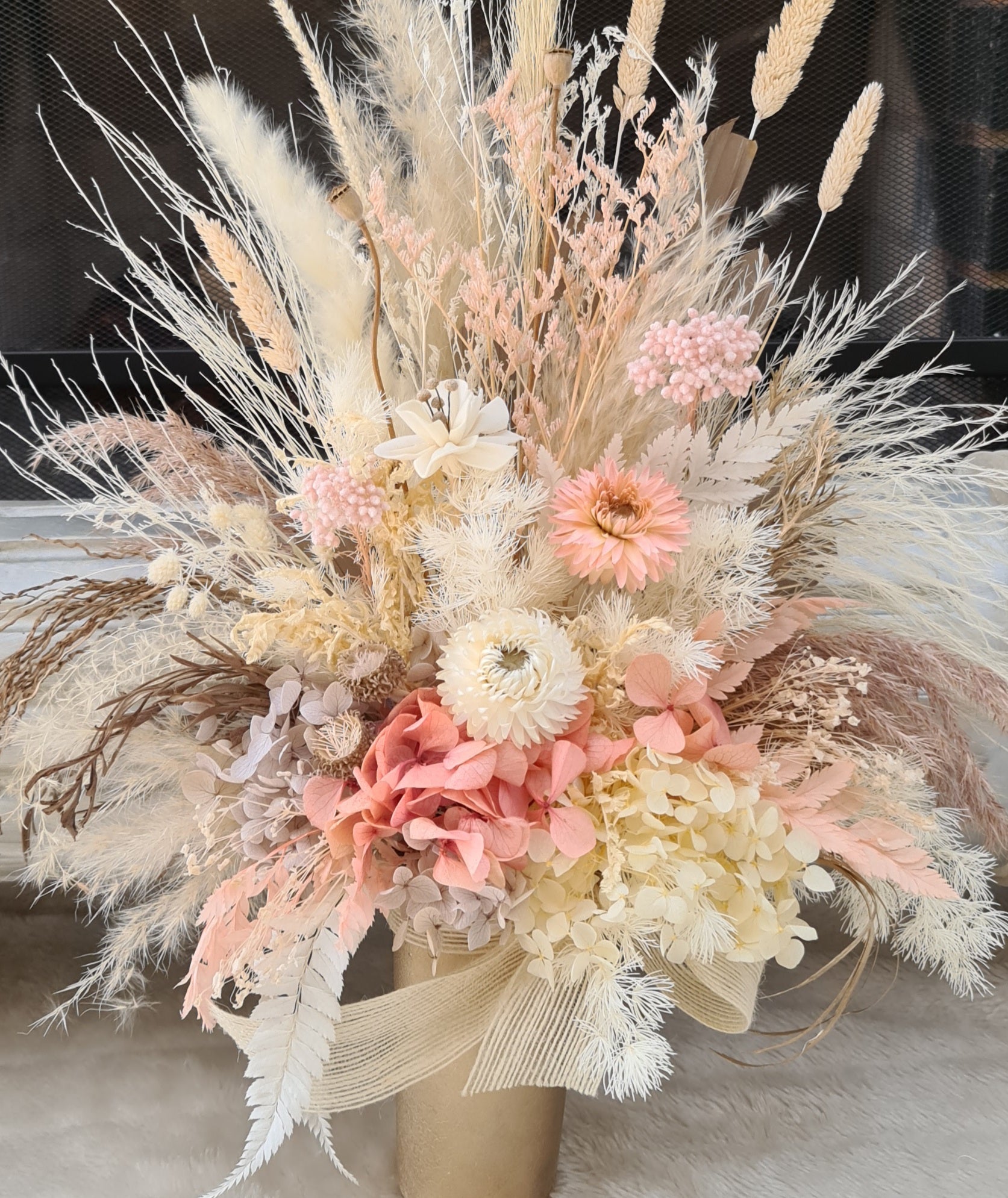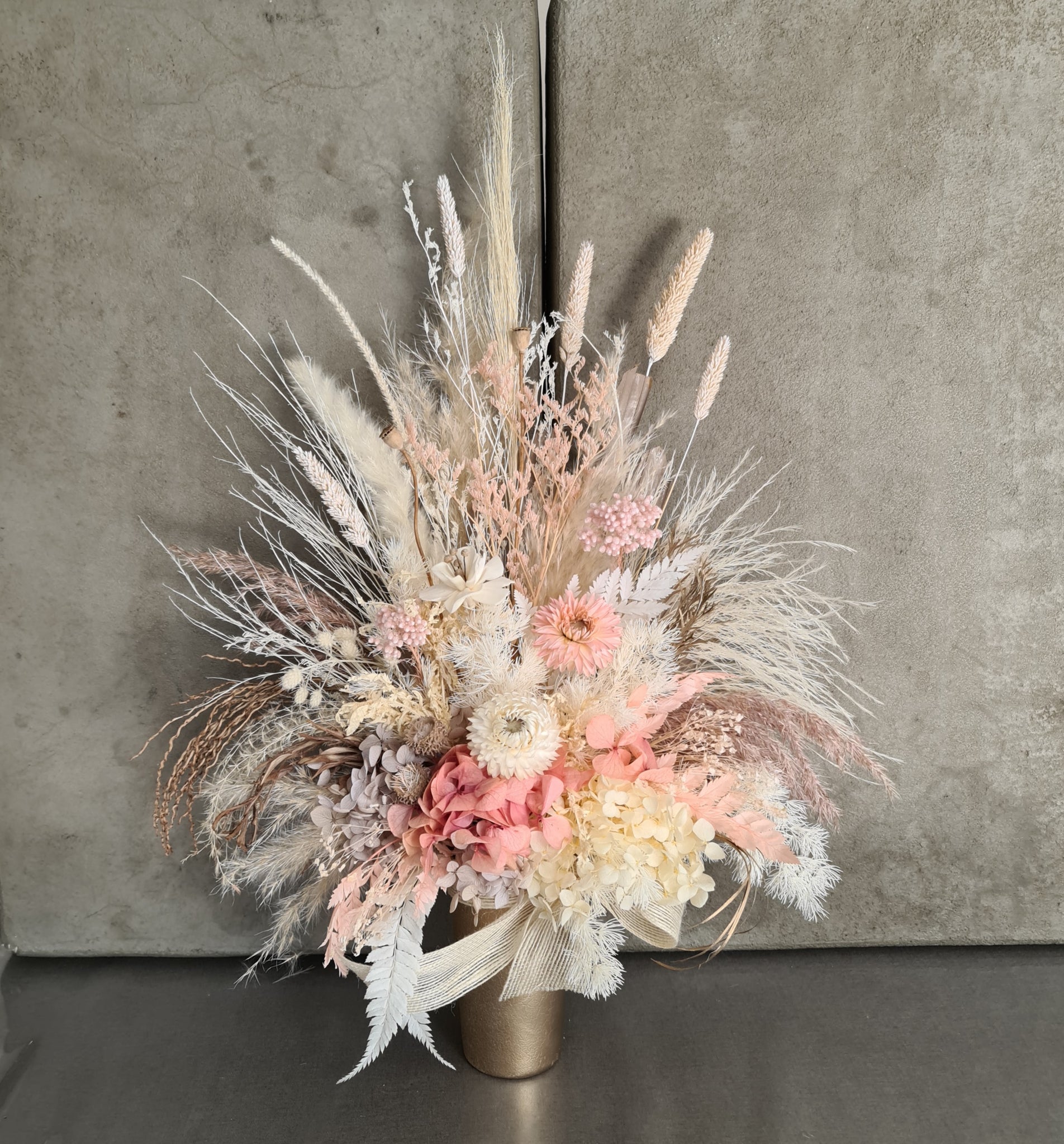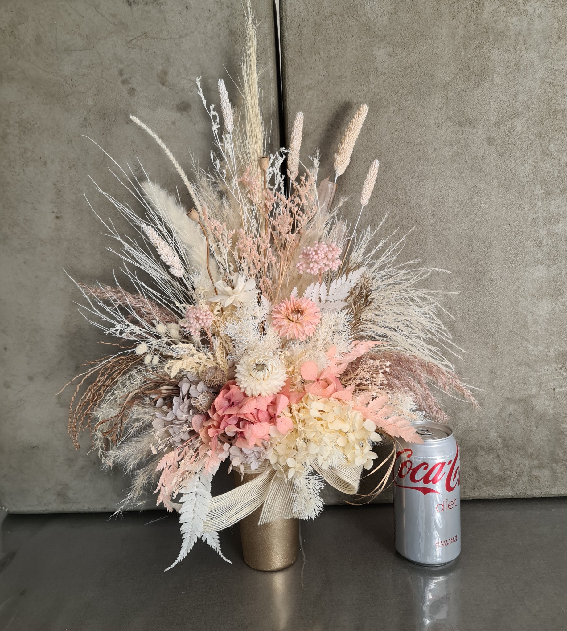 Everlasting preserved flowers boho blush tones arrangement in marble look champagne gold pot.