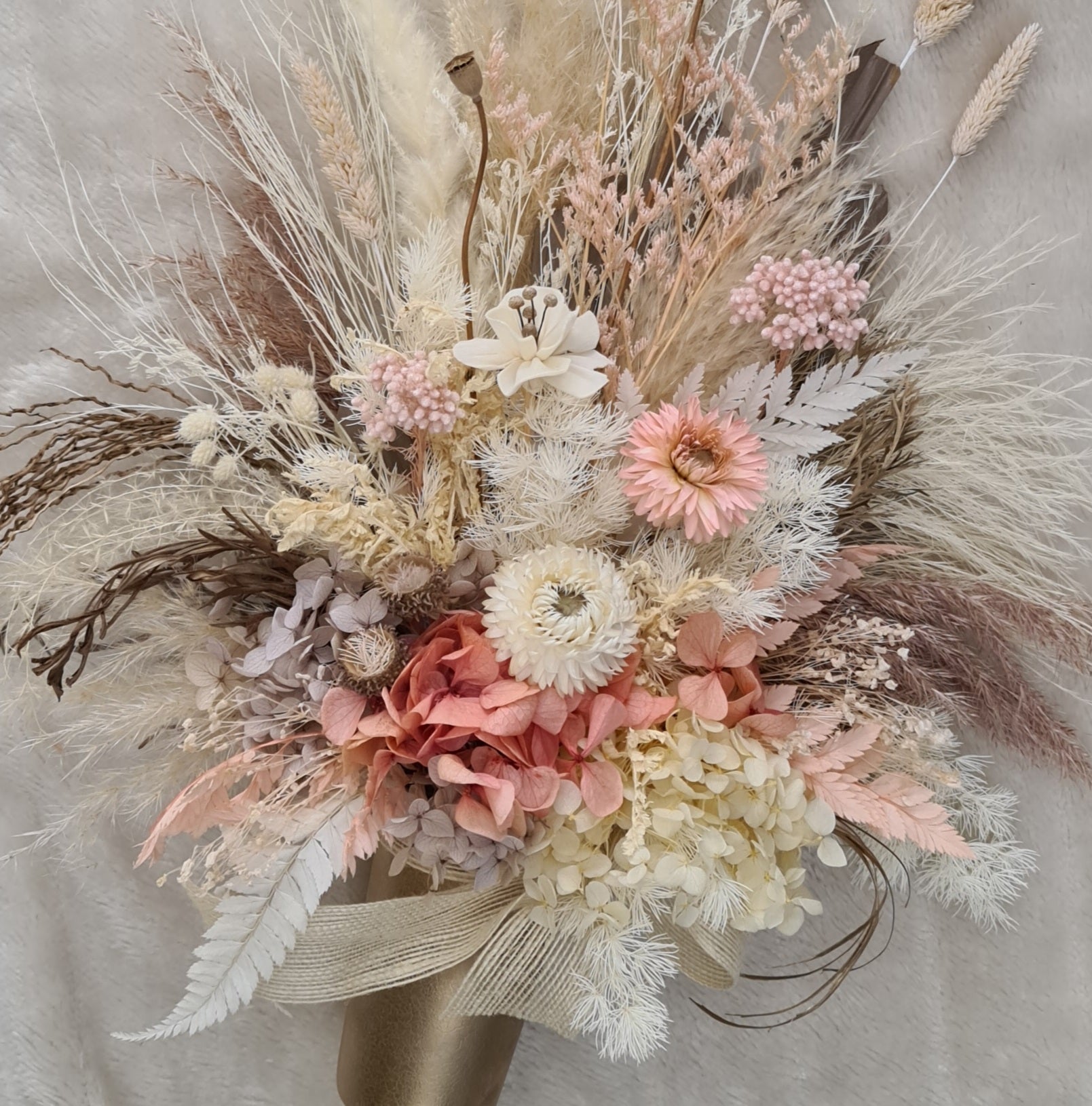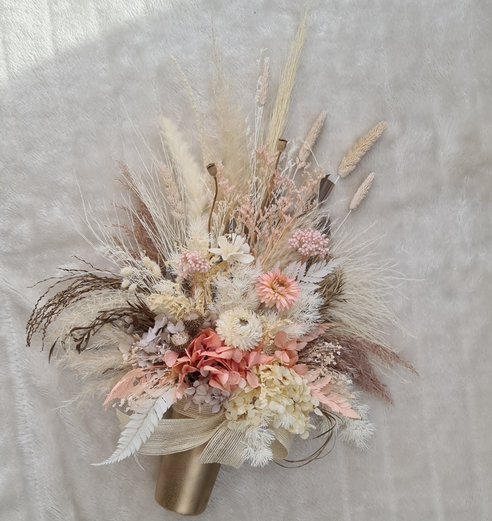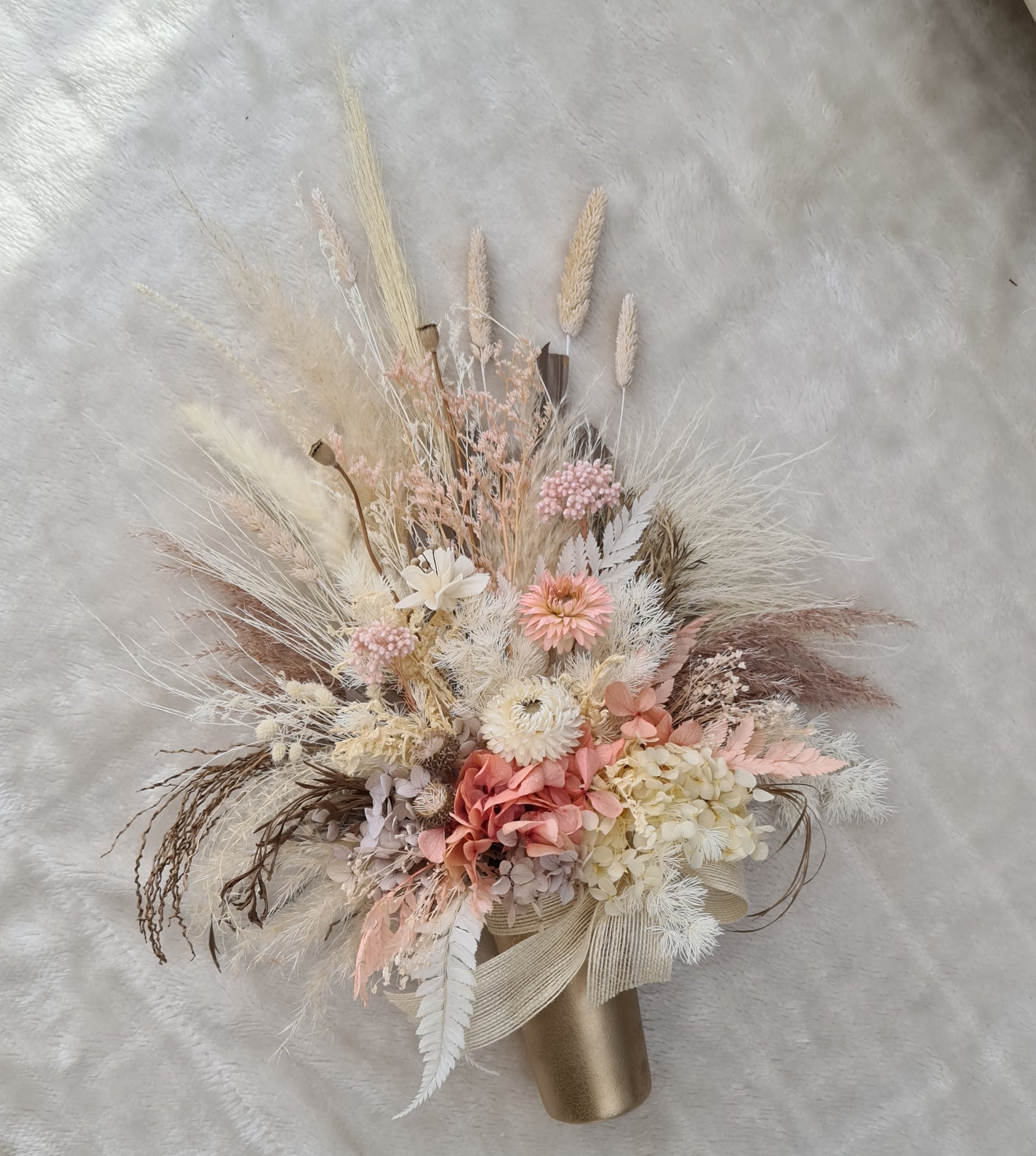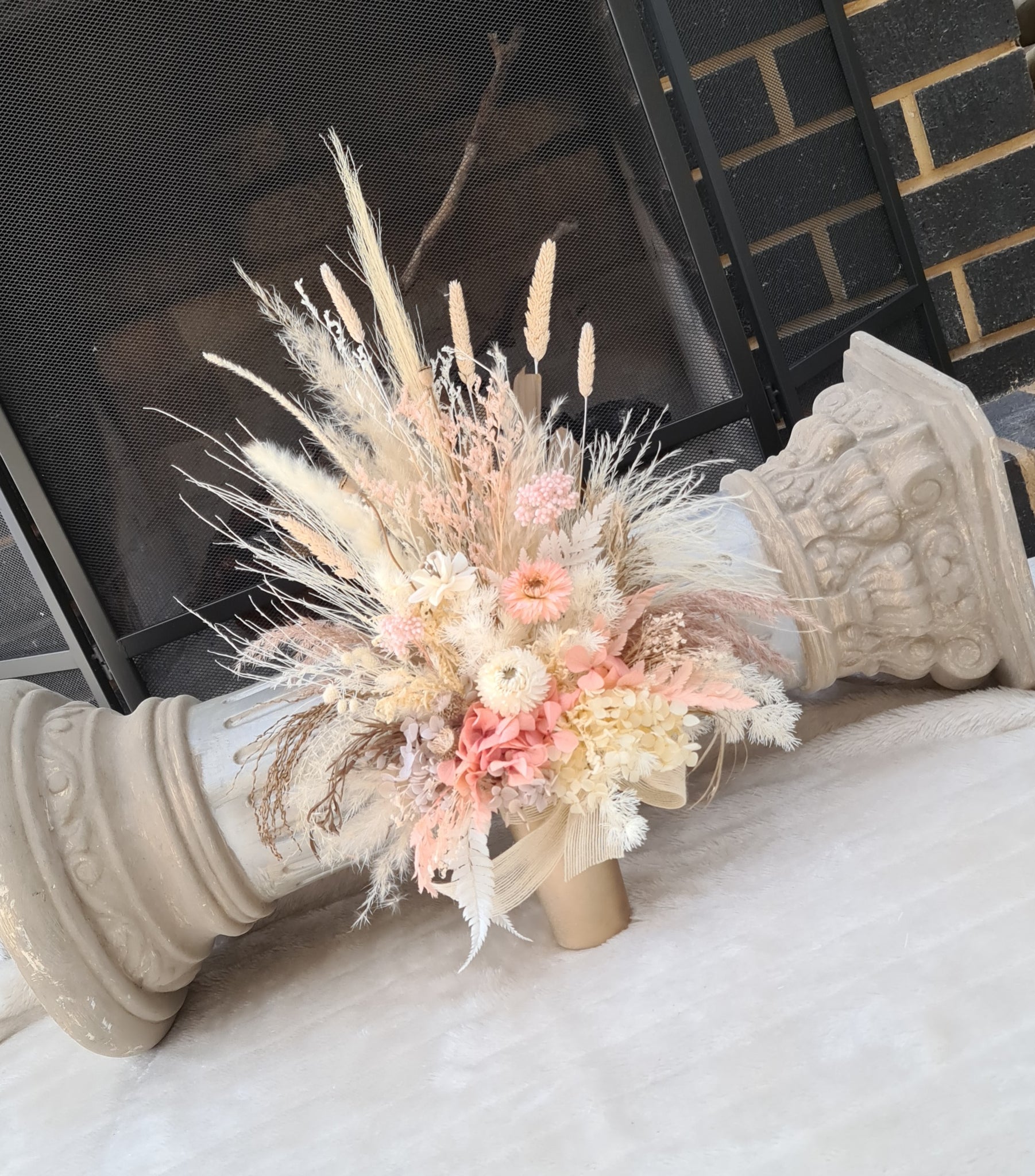 Everlasting preserved flowers boho blush tones arrangement in marble look champagne gold pot.