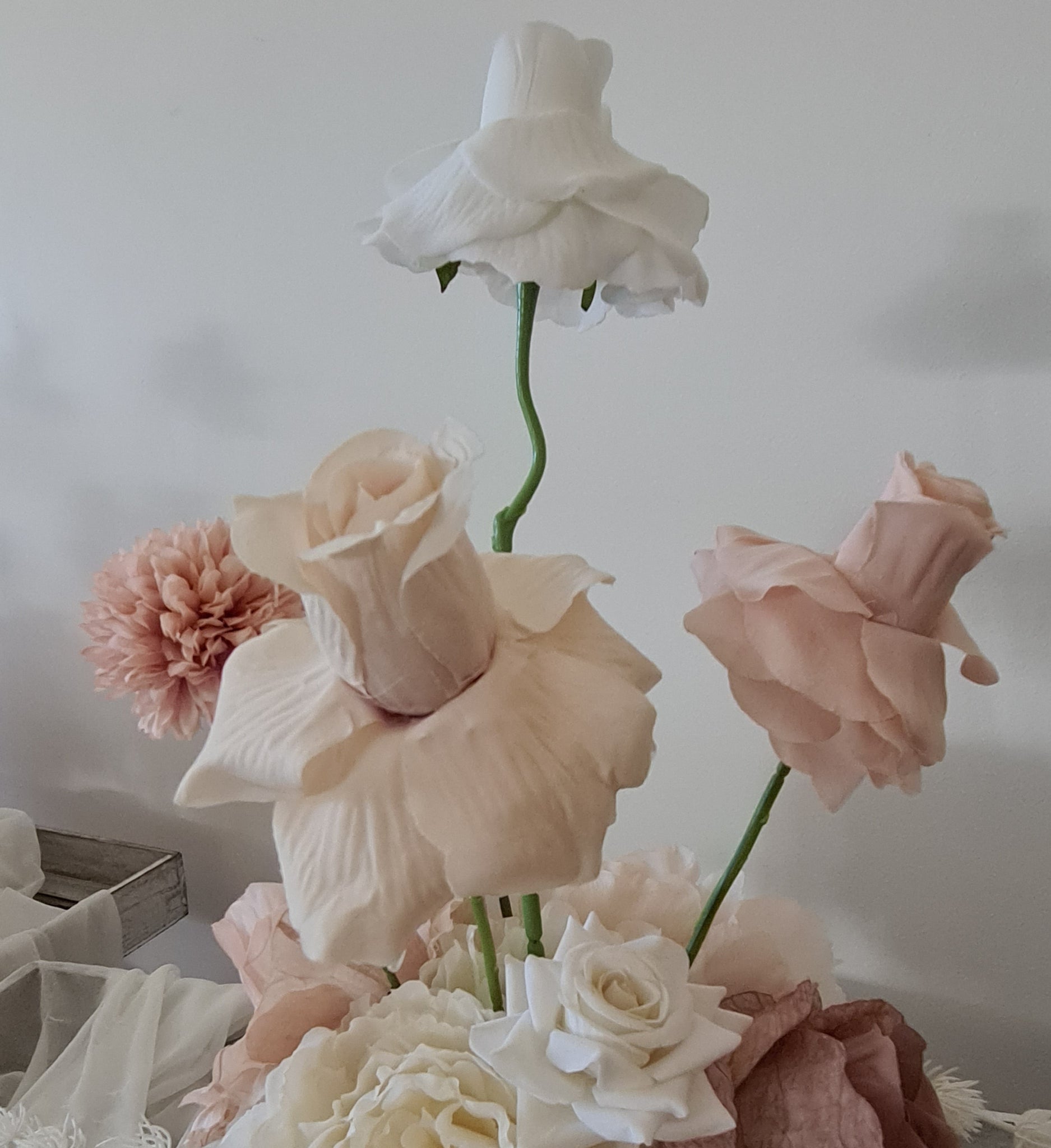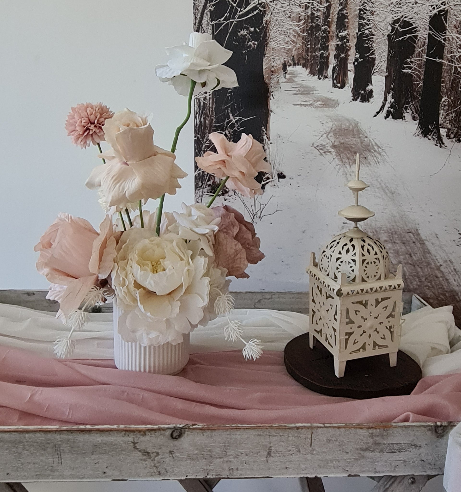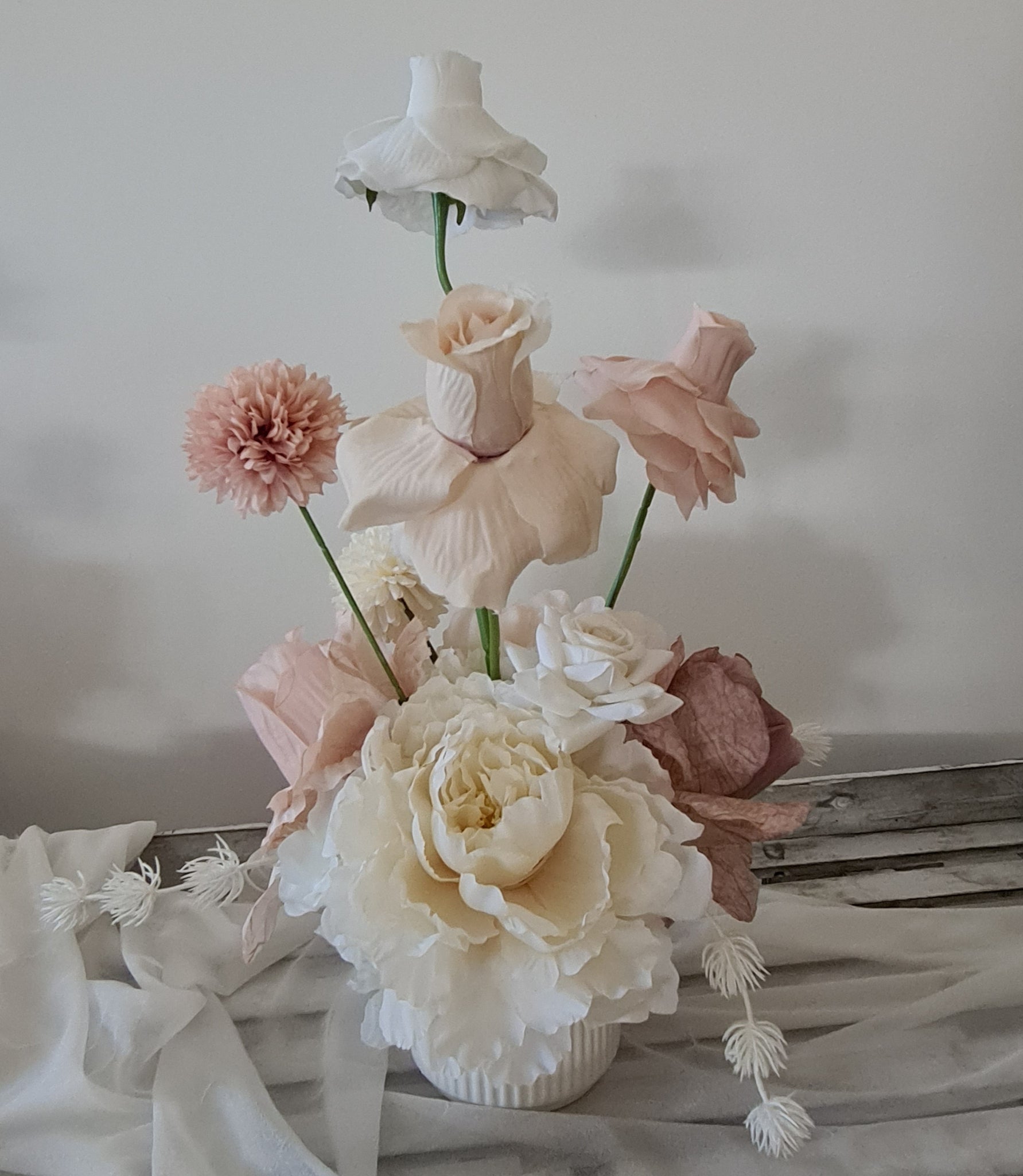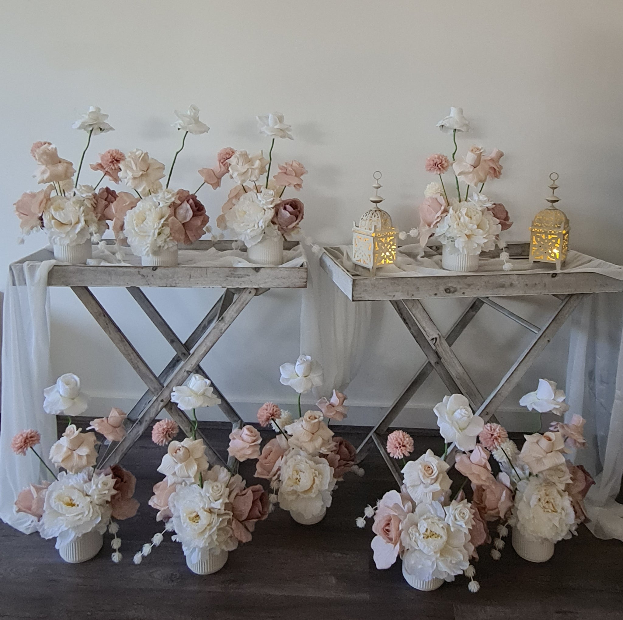 Realistic faux blush & neutral flowers; can be used as table flowers or aisle flowers for ceremony.