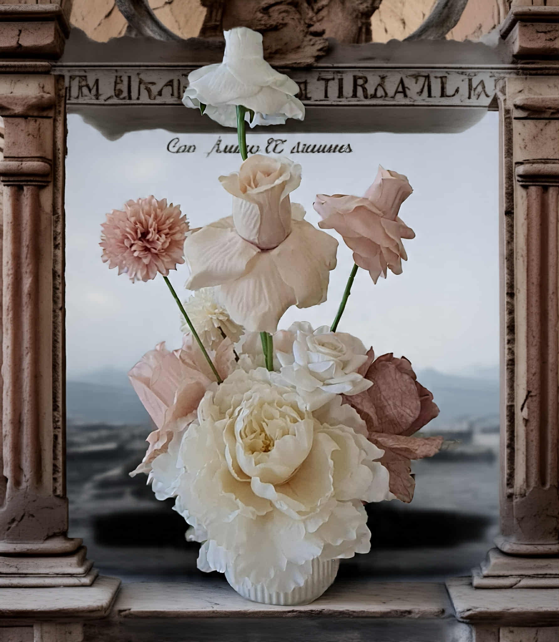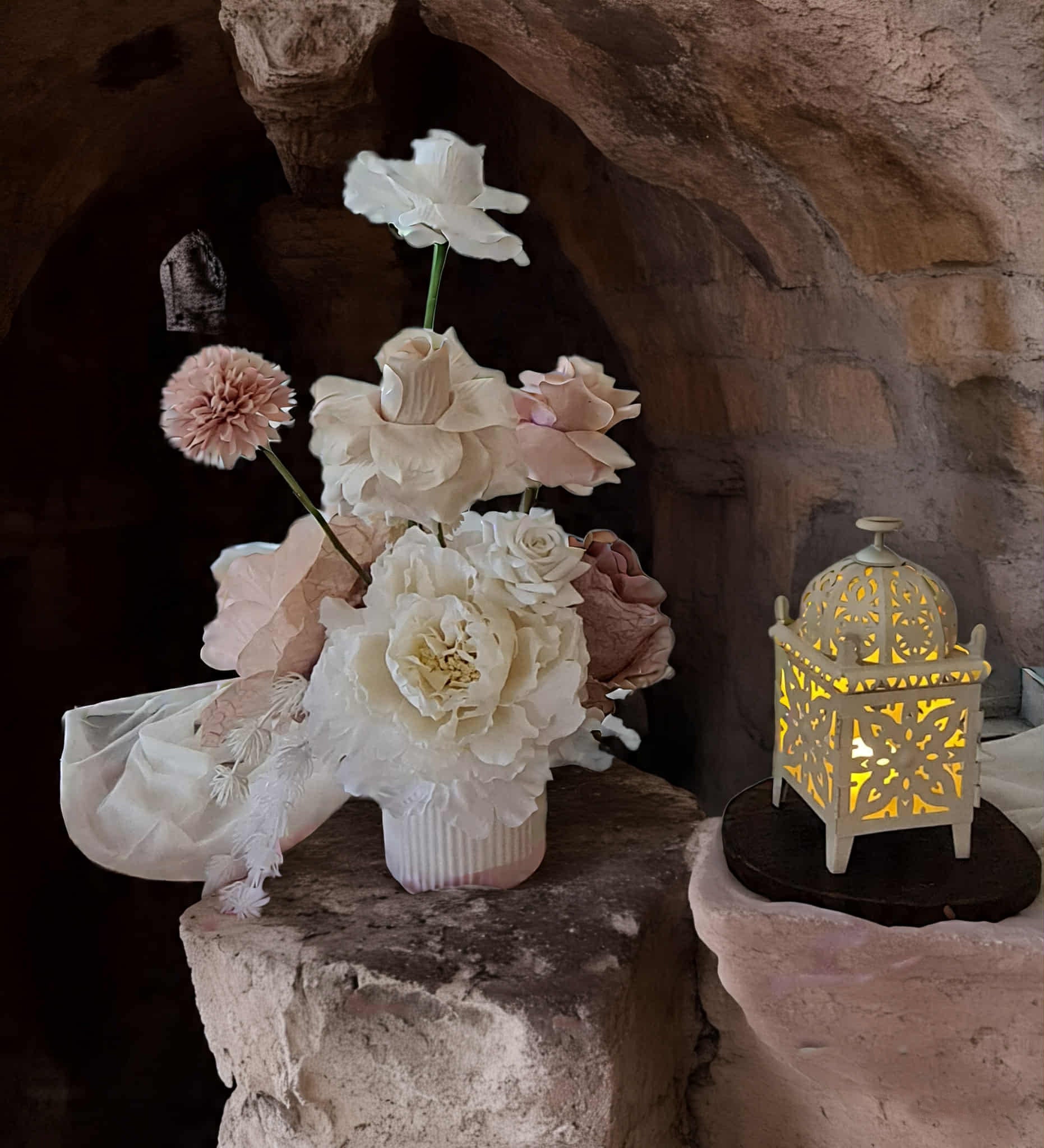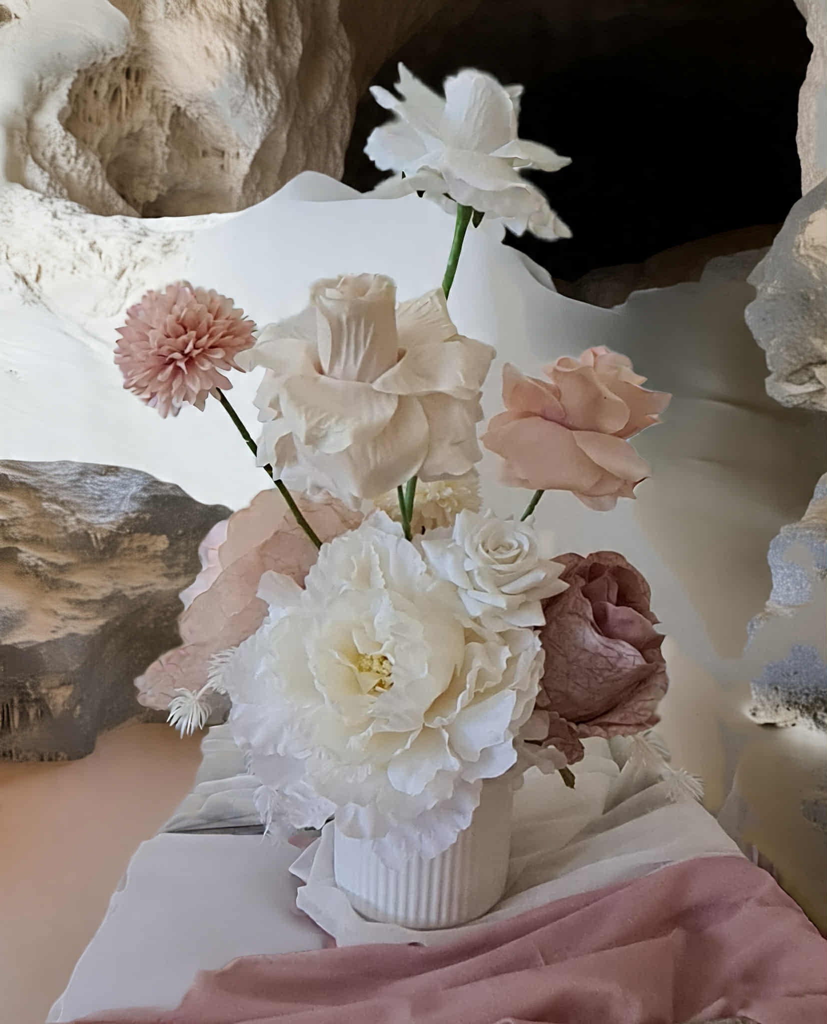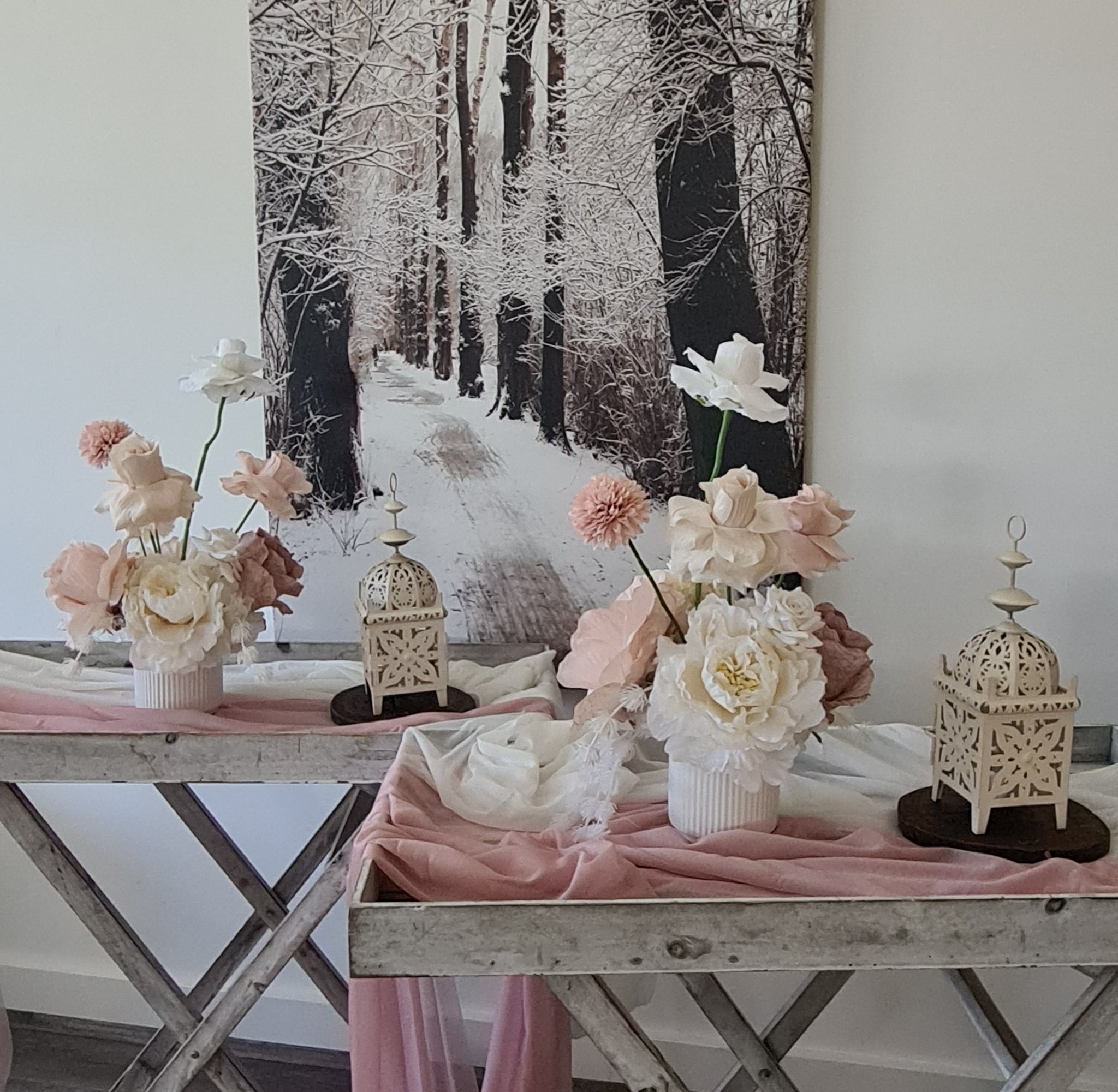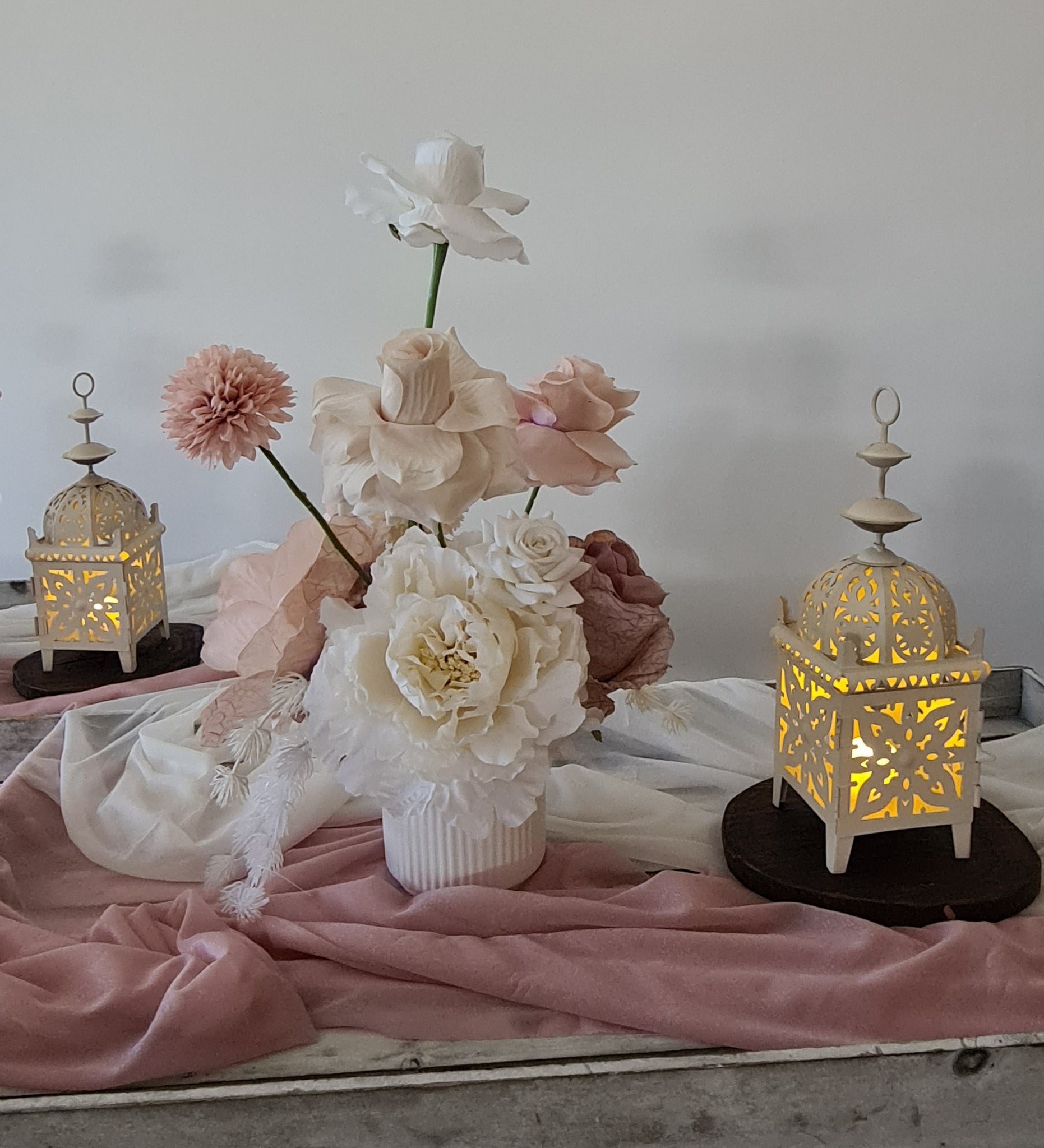 Realistic faux blush & neutral flowers; can be used as table flowers or aisle flowers for ceremony.