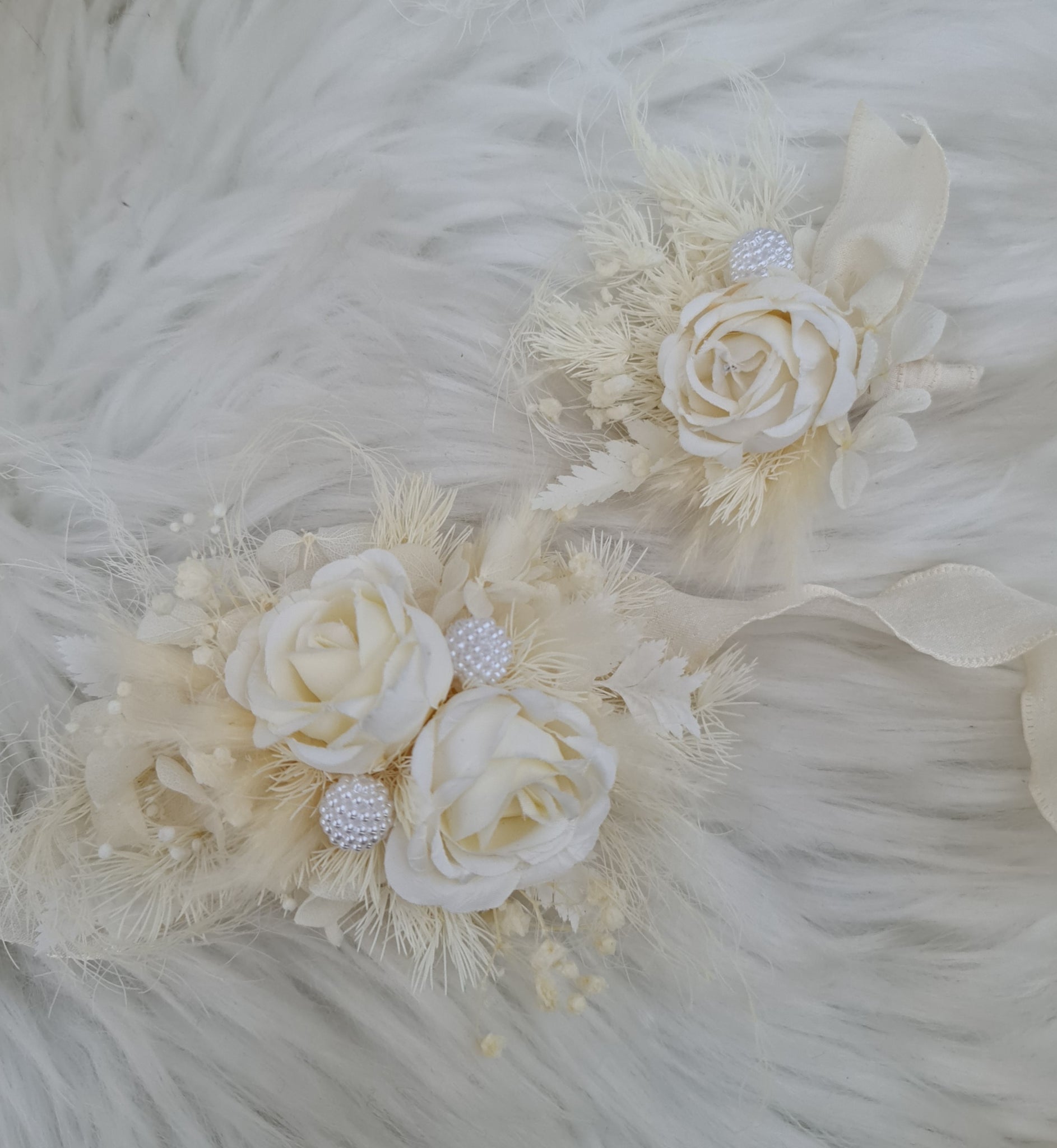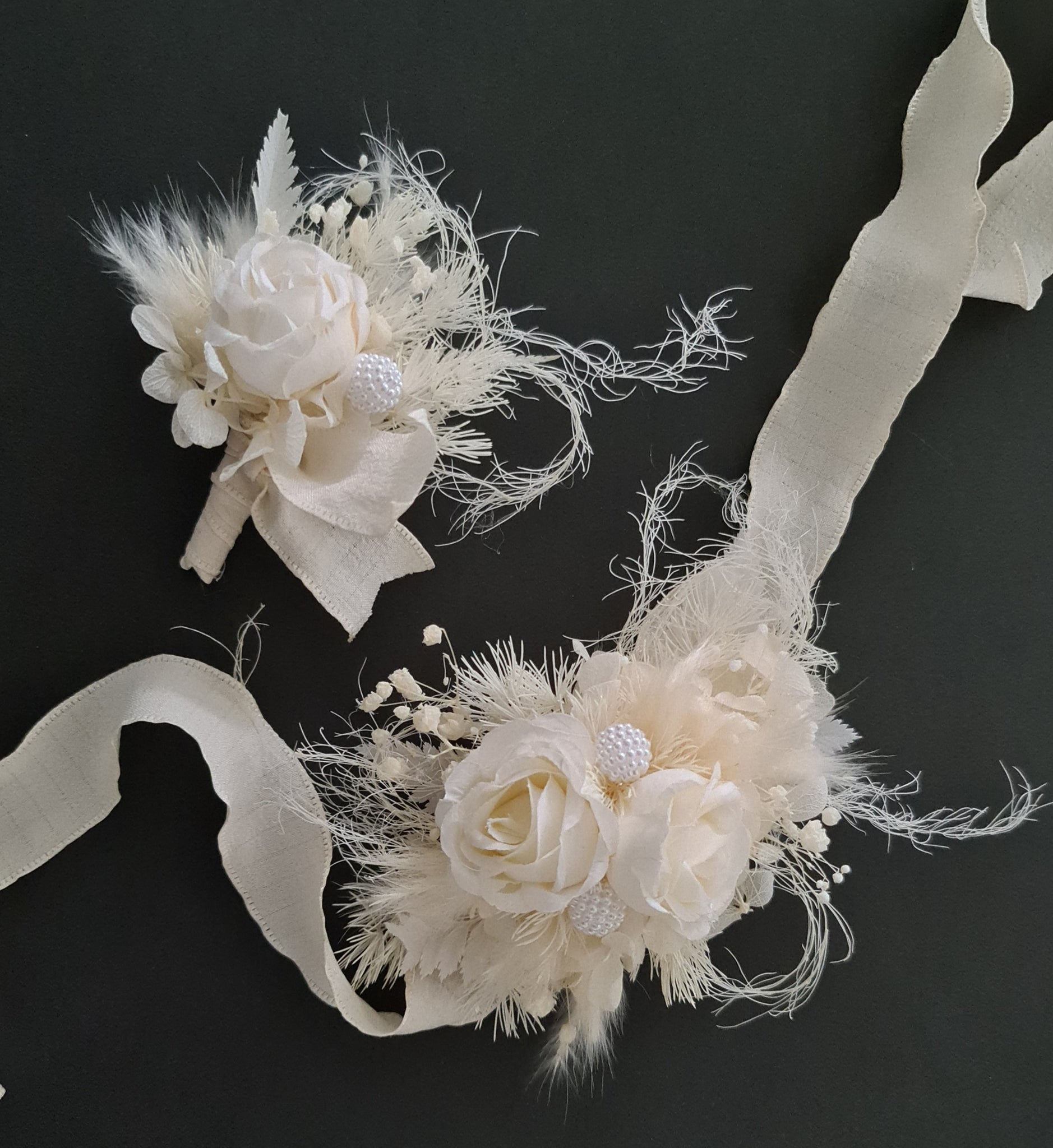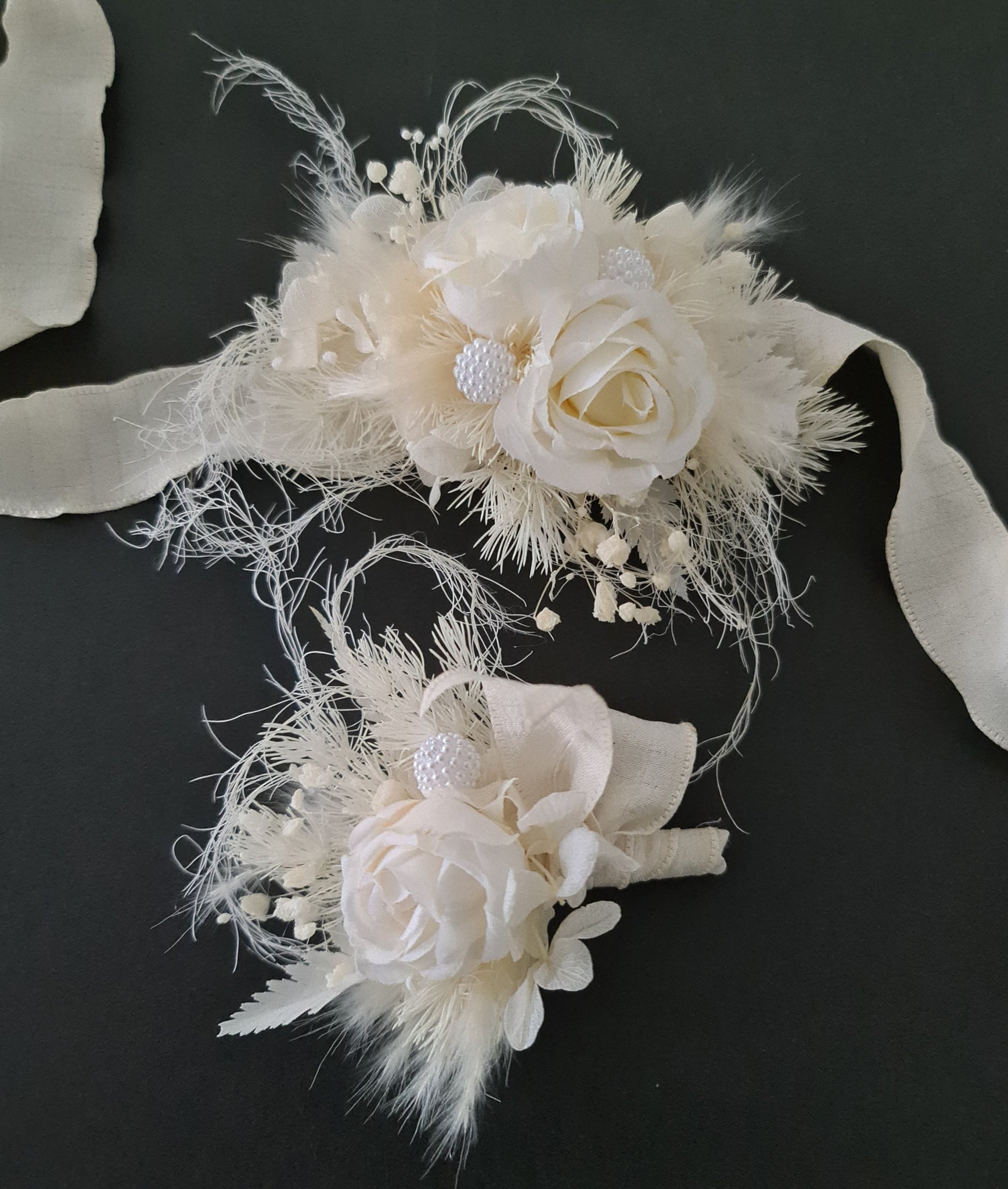 Preserved flowers boho style corsage & buttonhole set with mini silk peonies