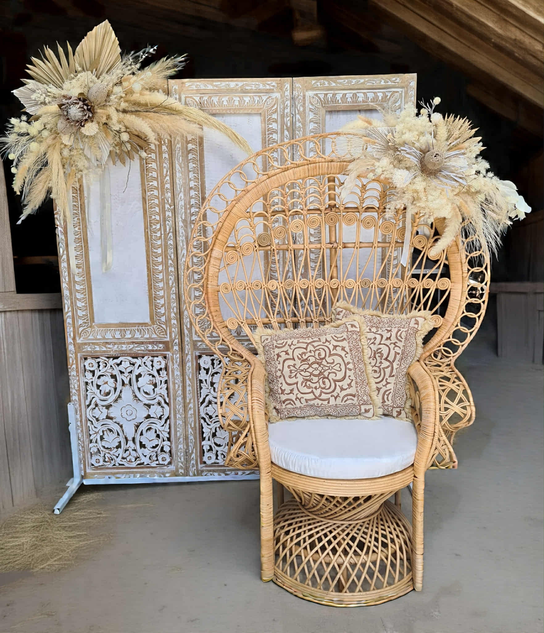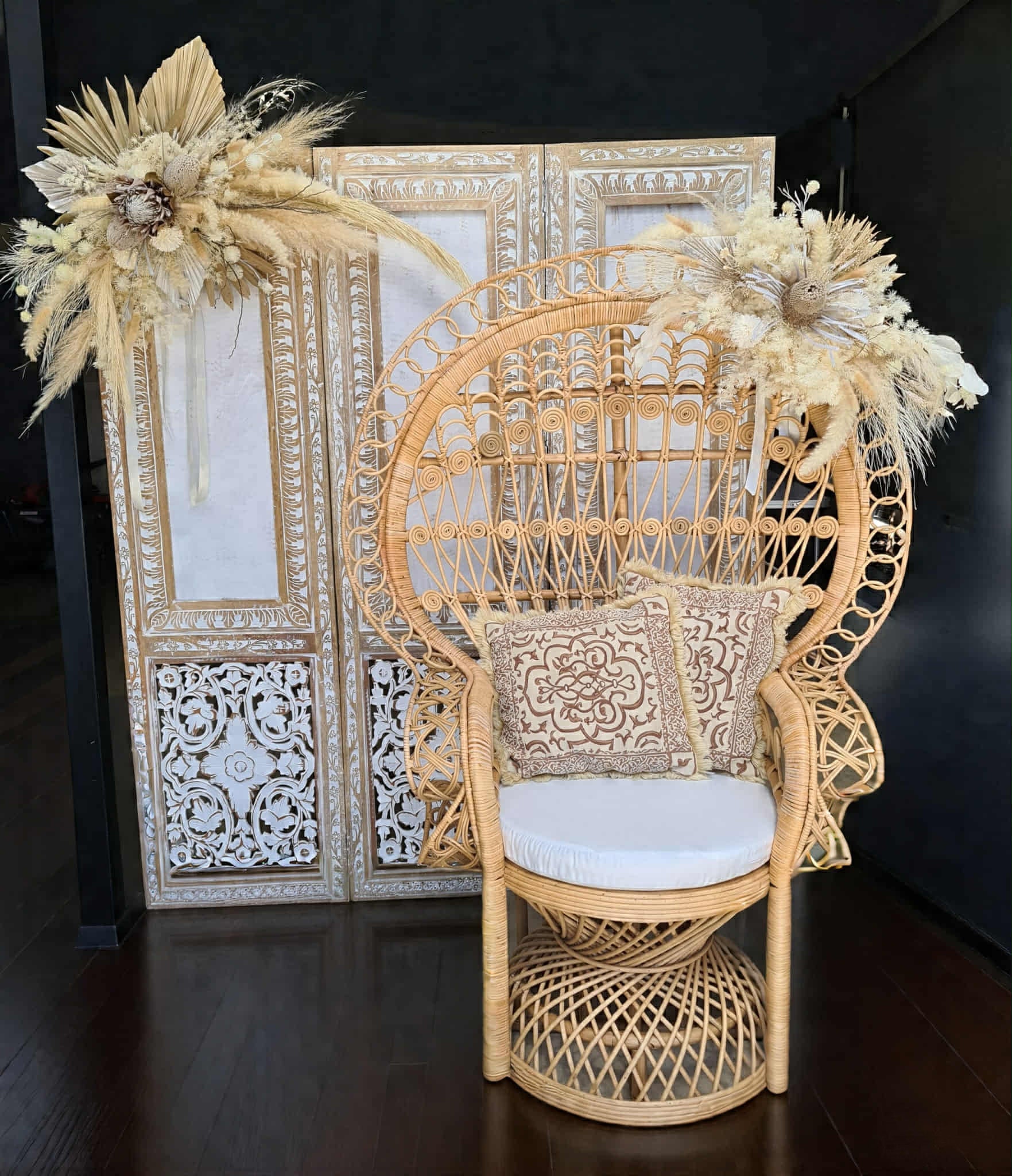 Boho Advanced set up Peacock Chair, 2 x flowers & backdrop