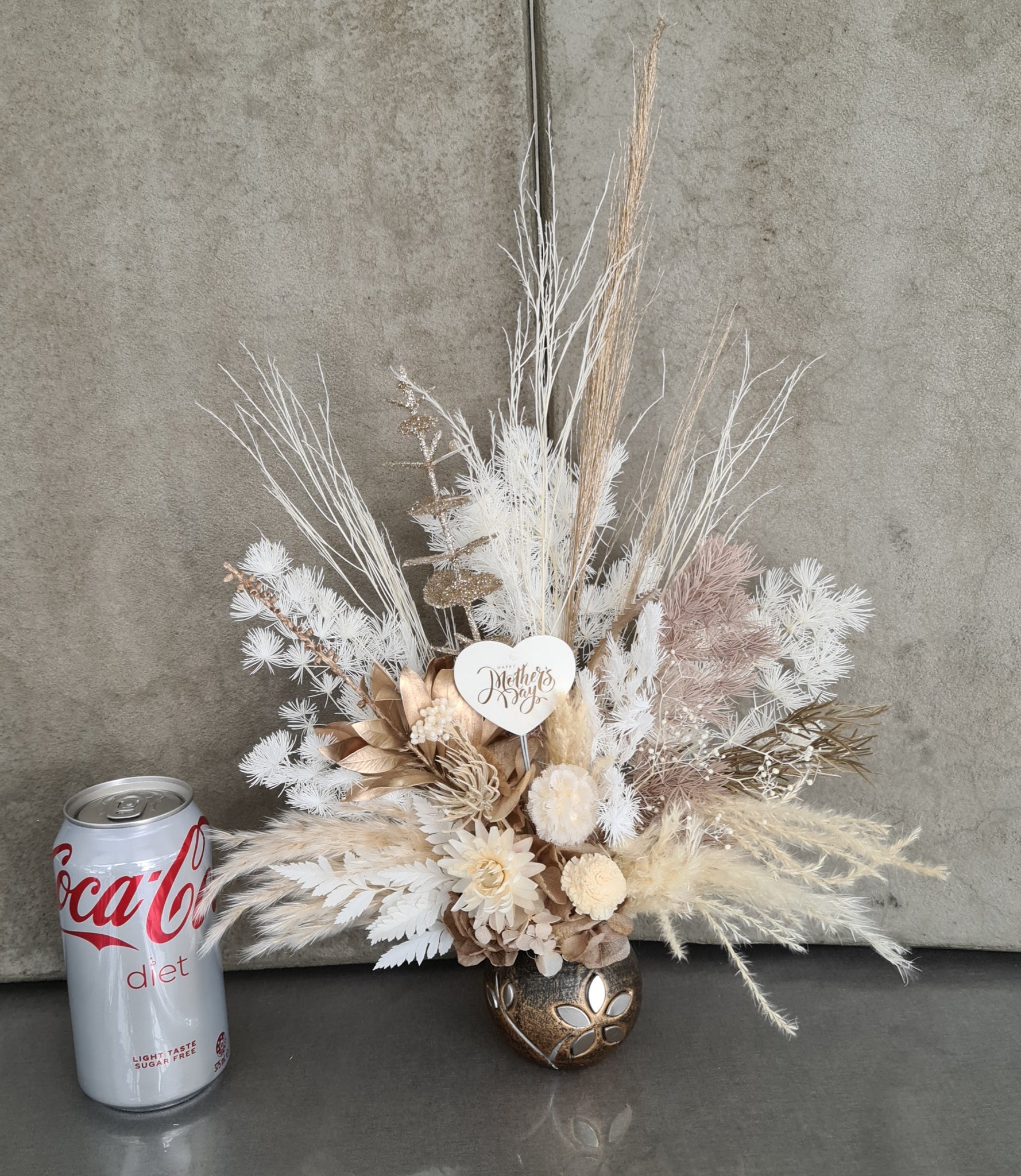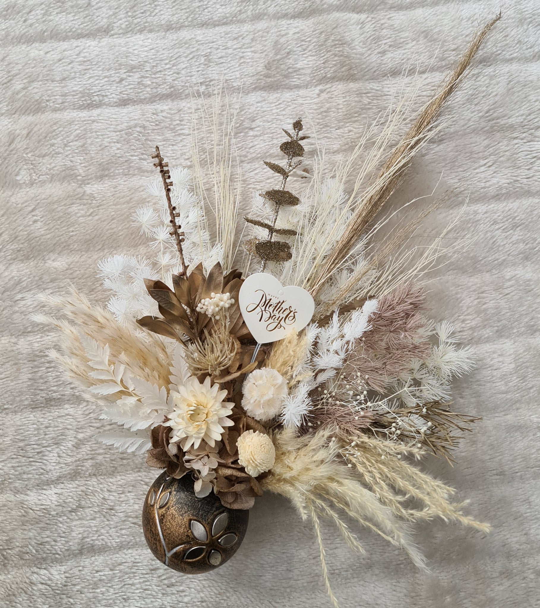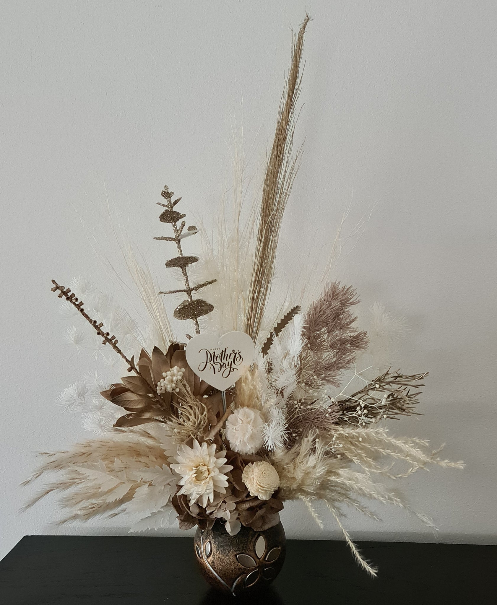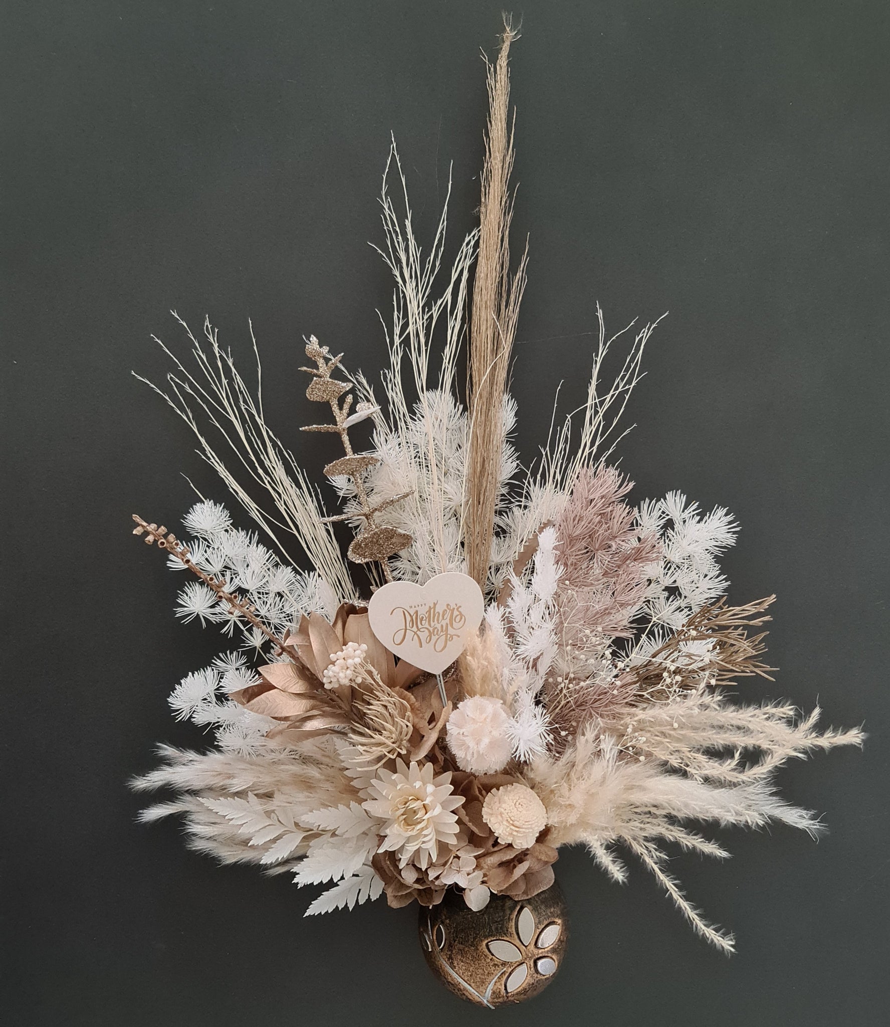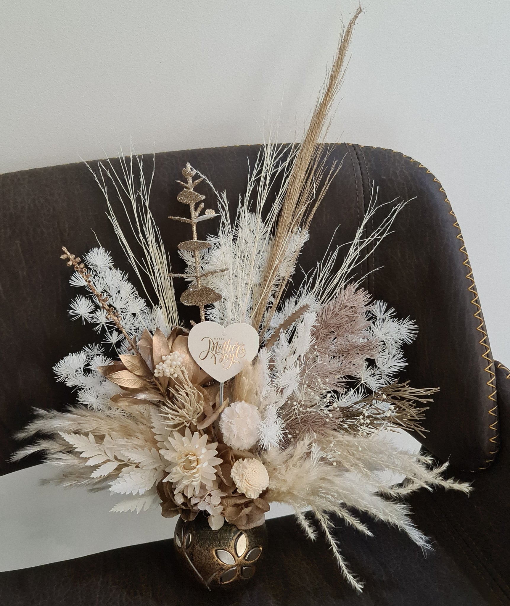 Everlasting & preserved flowers in boho style with “Happy Mother’s day” love heart topper in unique handmade pot
