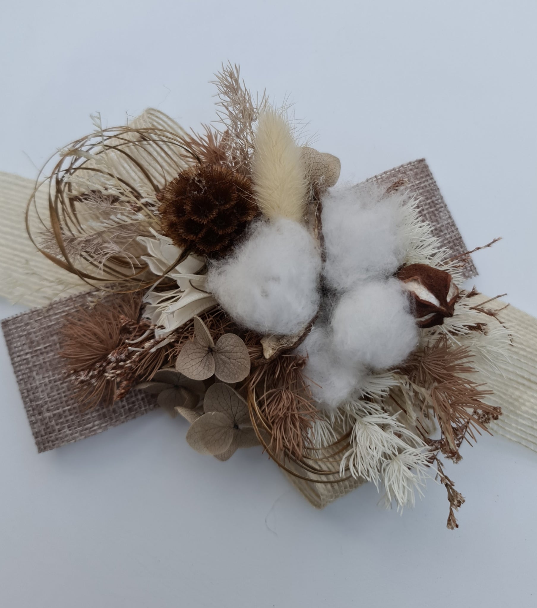 Wedding or School Formal Boho style corsage with cotton flower, scabiosa pod, preserved hydrangea in earth colours