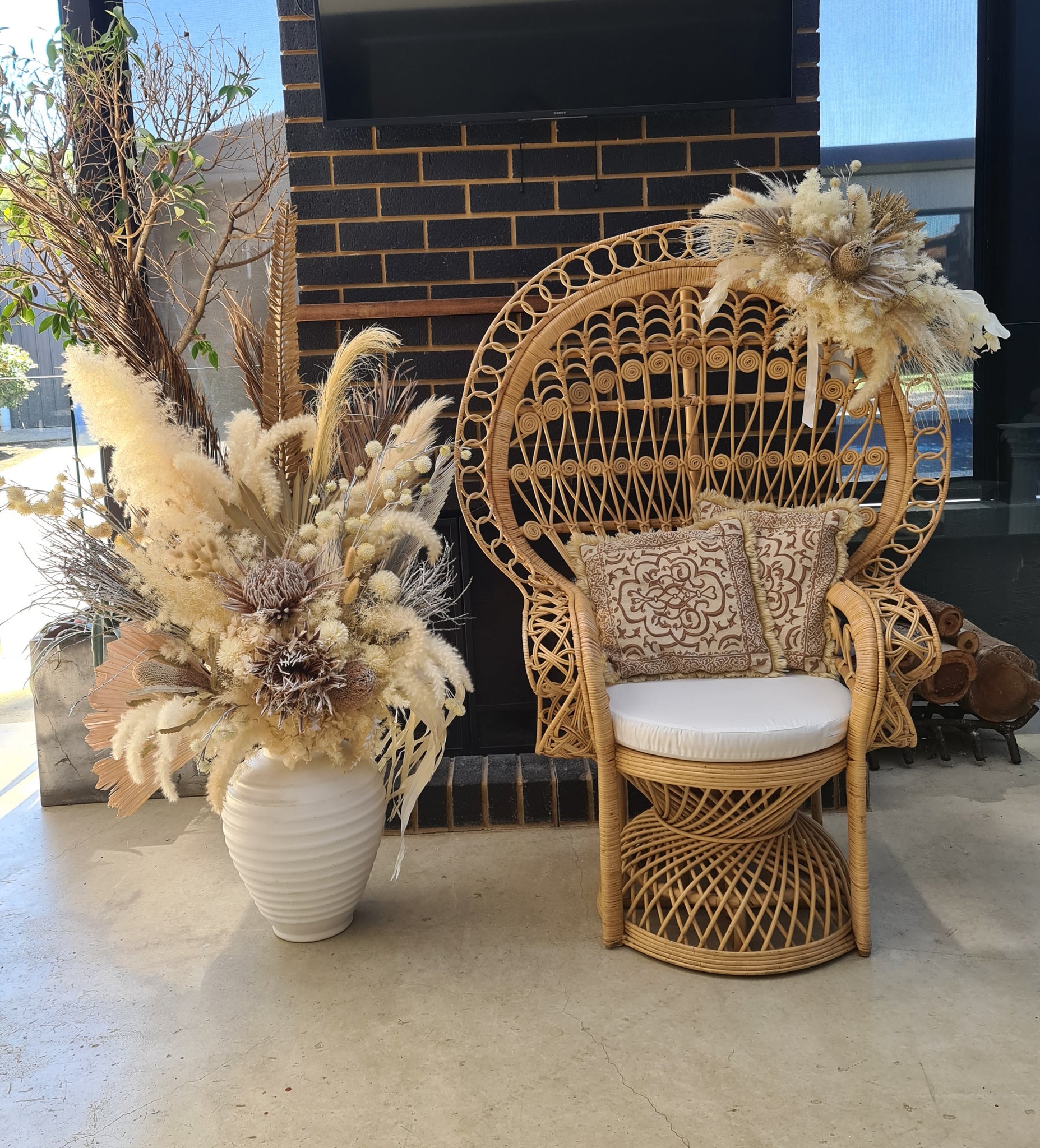 Boho set up Peacock Queen Chair, Chair Flowers & Flowers in urn