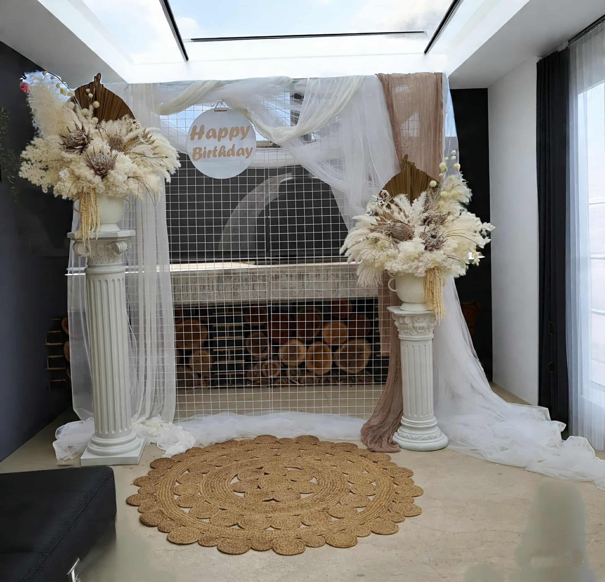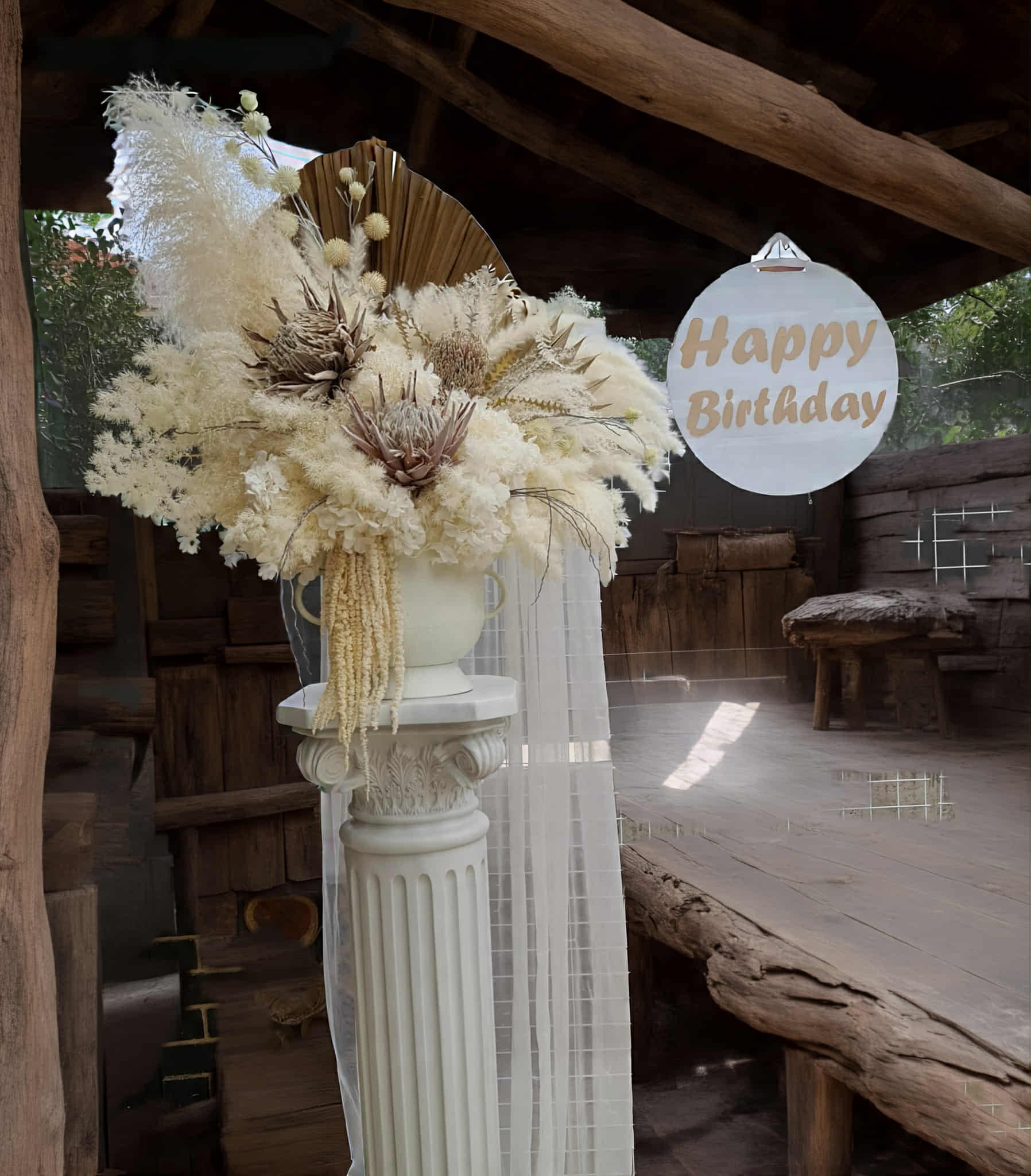 Boho urns & white mesh Roman columns Birthday package
