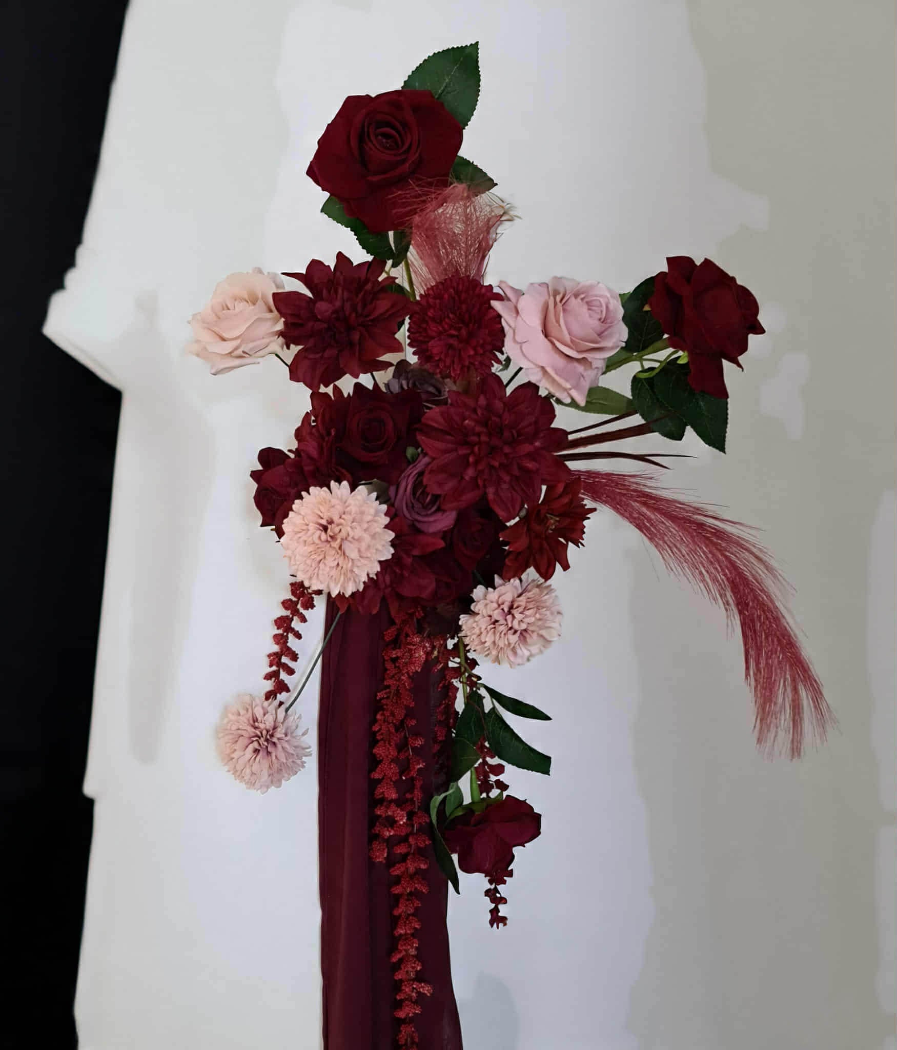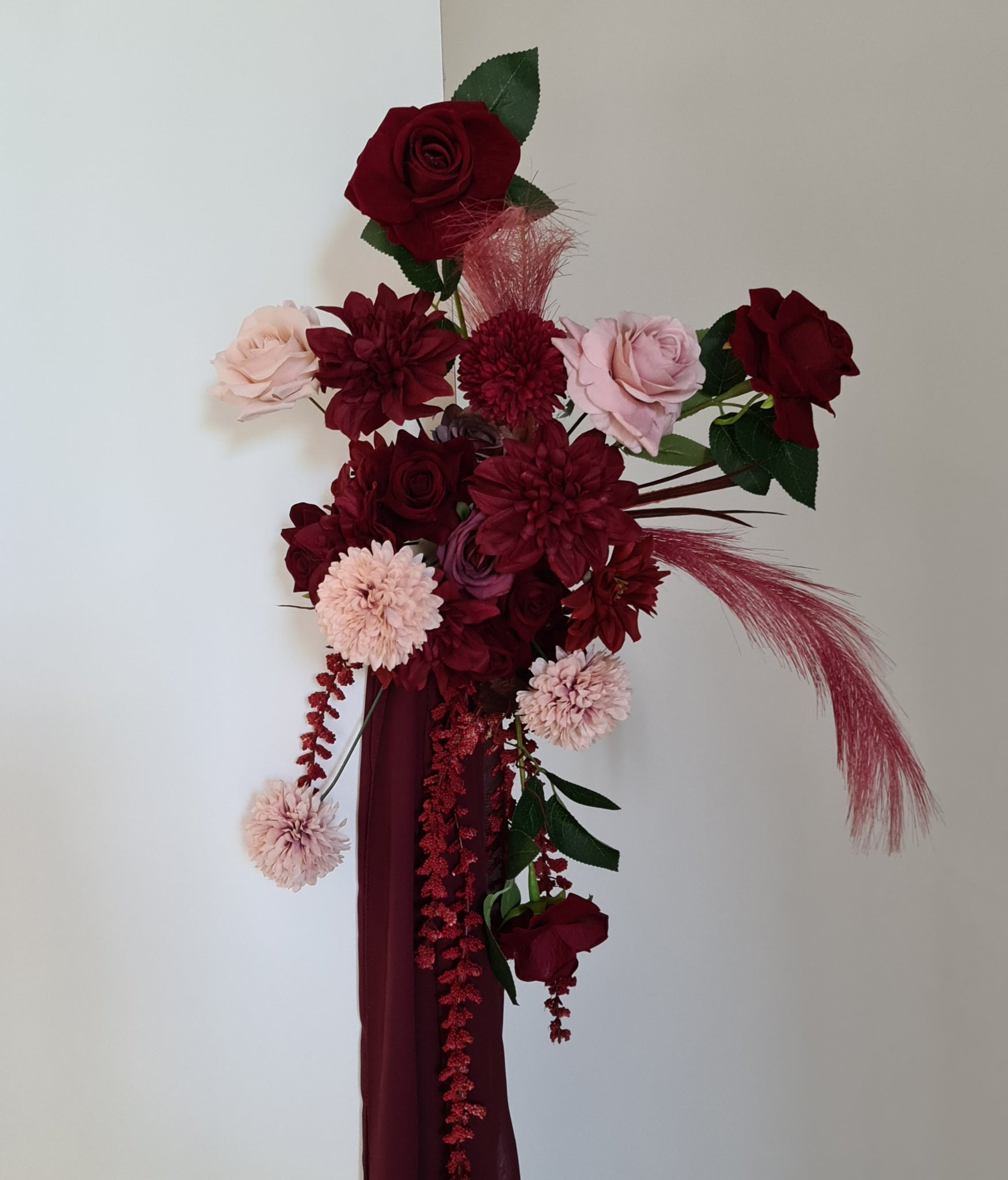 Smaller size burgundy & pink flowers – can be positioned on the floor at the front of plinth, hang on easel (welcome sign) or on arch / backdrop