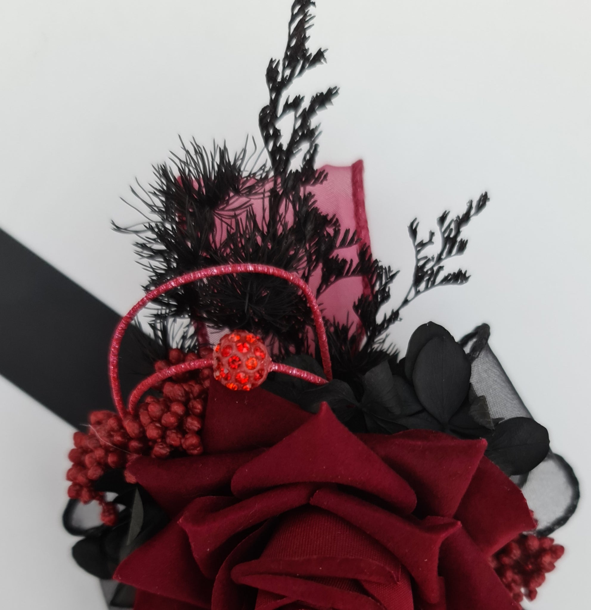 Combination of preserved flowers in black & red with burgundy velvet rose and crystals